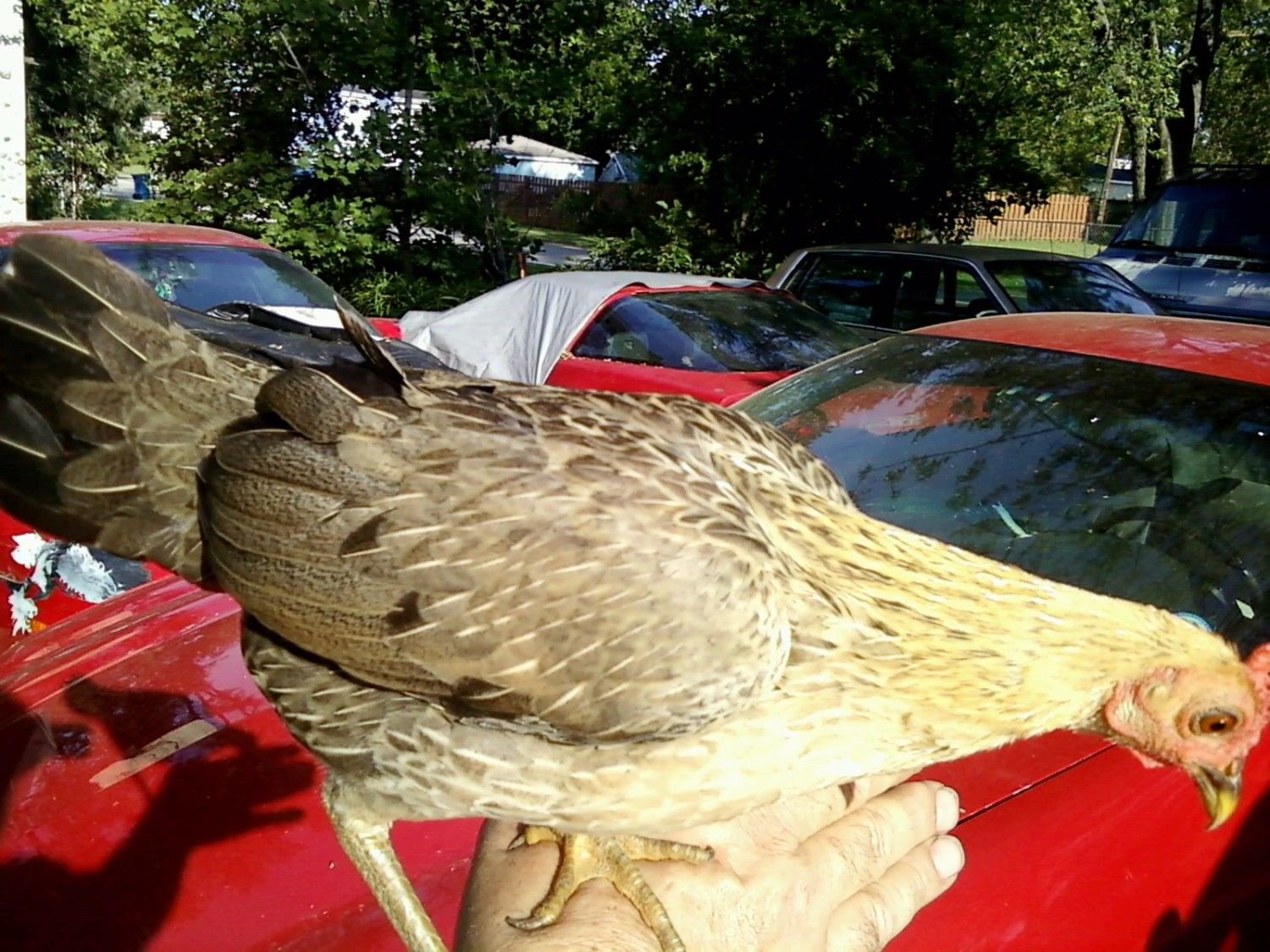 A pleasant update. Well Friday I lost 2 chickens to Rocky raccoon. Saturday evening Shannon shows up. I WAS SOO PLEASANTLY SURPRISED,. Picked her up and only seen a few broken feathers. She flew and escaped the jaws of doom. Must have been hiding in neighboring yard. Was MIA all Saturday until evening. I see this as a RAINBOW AFTER A STORM... I reserve MIRACLE for people related incidents.YOU KNOW I AM HAPPY.!!!![]()