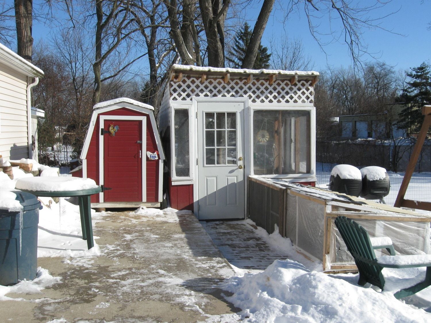 I'm in the W suburbs. I personally started with an A-Frame coop for my very small flock. It was perfect with a nice 3" gap running along either side of the bottom (covered with hardware cloth) and a 3" gap running along the top covered with aluminum stovepipe, which allowed venting at either end of the coop. I started out bedding with hay, but have switched to pine shavings. They break down faster and are easier IMHO to compost. In the winter, I like to leave a big brick of it for them to break down over time. My chickens love to tear stuff apart! My neighbor likes the pine pellets.hi everyone,