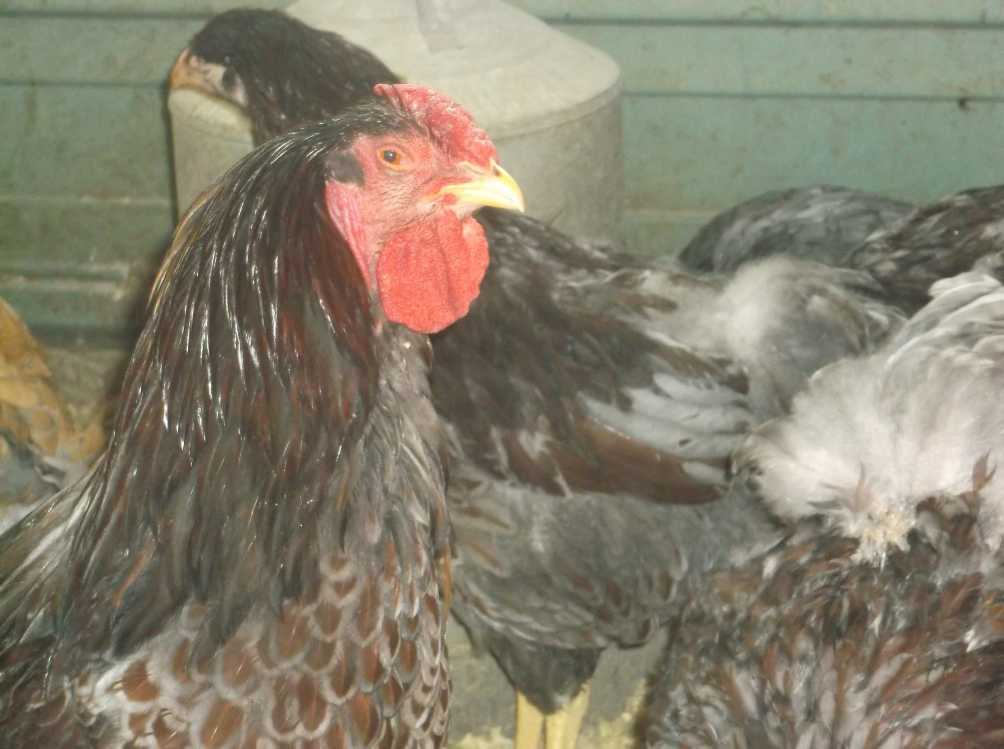 Sorry it took so long for me to get back with a few photos of our BLR Wyandottes. You have to excuse my photography skills they are lacking and my subjects did not want to cooperate. The first photo is of some of the hens, don't mind the turken and cuckoo maran hens...they would'nt get out of the shot. There is one of the roosters in the 2nd photo. They are all regrowing feathers after their molt, so everybody is looking kinda fuzzy.