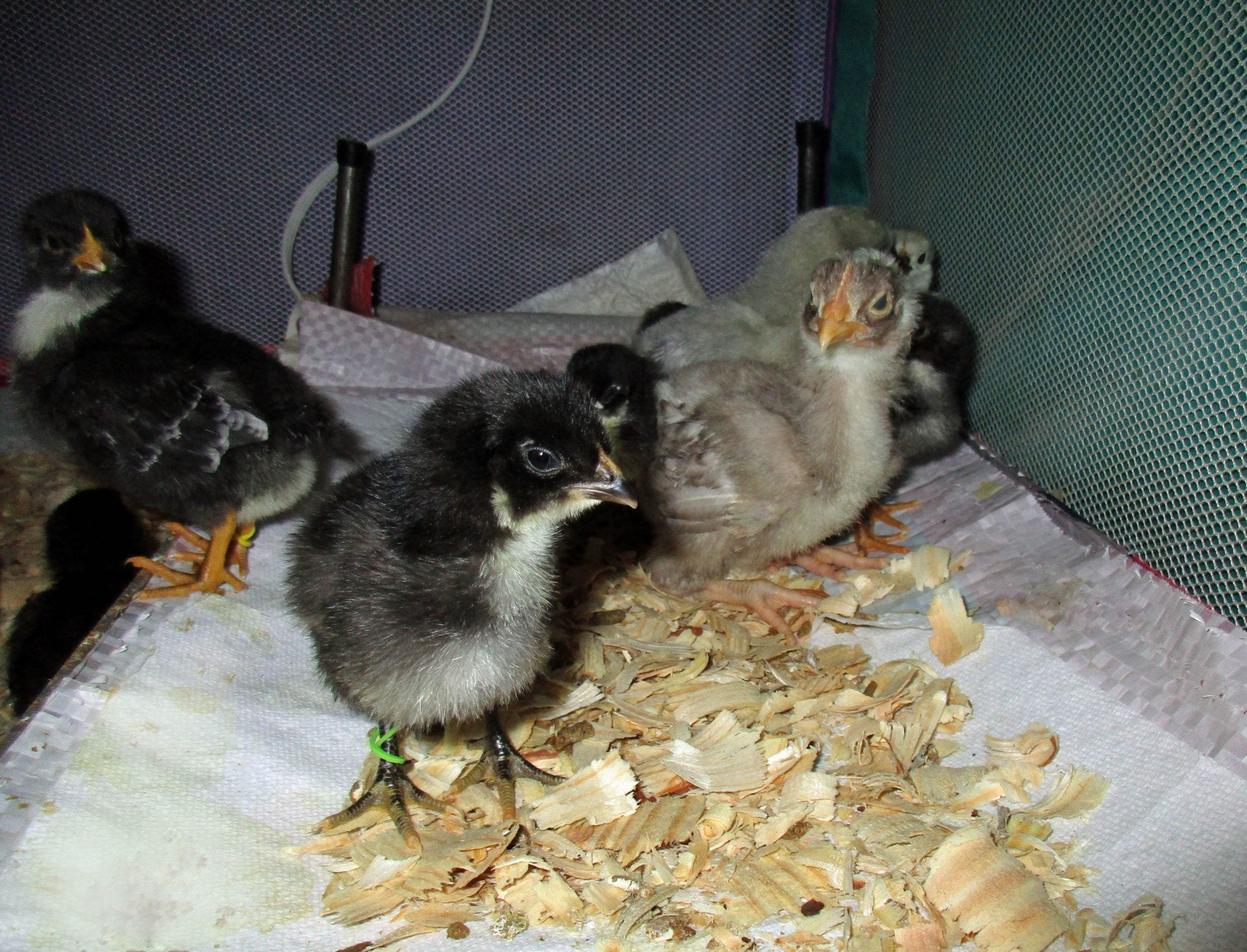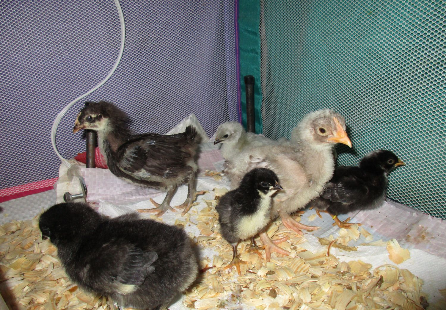 It was nice meeting you today. Your chicks made themselves at home quickly. They learned how to use the chicken nipples in about 60 sec. (A new record, I think.) The big male saw a chick drinking & gave it a try. The other two followed his example. They were more apprehensive about putting their head into the feeders, but within 10-20 min, they figured that out too. Right now, they're snuggled in a chick pile on top of the Mama Heating Pad.