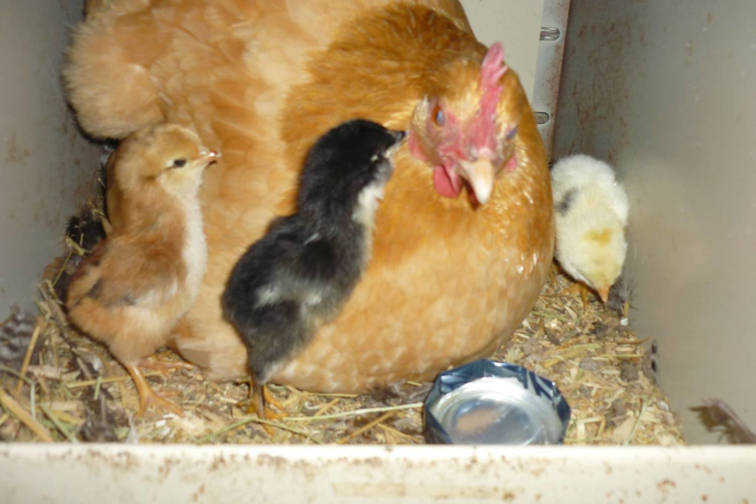 Here's the other three that hatched. EE daddy and (I think-please correct me if I am wrong) moms (left to right) Orpington, BR, Leghorn.