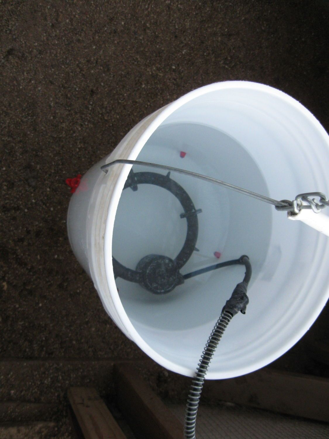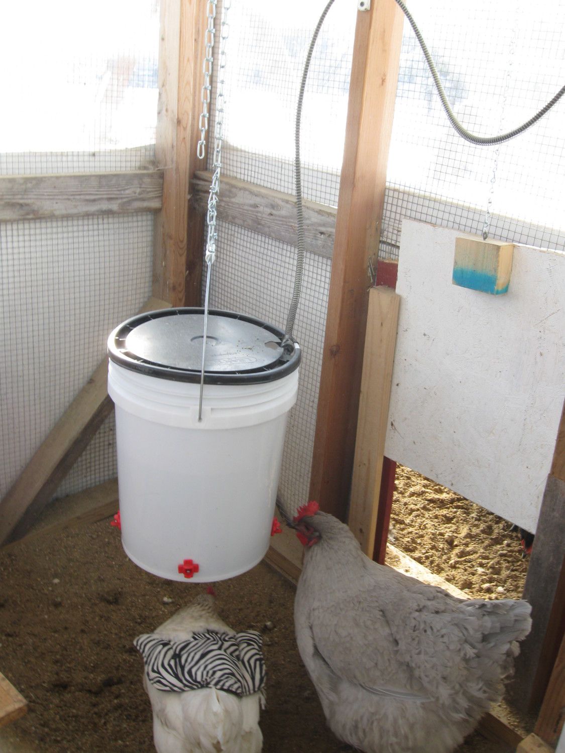 In the winter, I have a bucket de-icer inside. Although the water stayed liquid during our 1st winter, the vertical nipples froze when in single digits. I had to chip away ice many mornings that year. For the 2nd winter I switched to the horiz nipples. The horiz nipples are inside, so they didn't lock up when below zero. (If a tiny bit of ice were present, the chickens just peck it away to get to the water.) Originally I thought the heater was expensive, but it was about the same cost as a pre-made heated chicken waterer. The fact that it has lasted multiple winters makes it affordable. I also like that it only turns on when below freezing. The water is never "warm" but cold & liquid. Because of minerals in our water, I added a filter to our kitchen sink. (Not for us, but to prevent mineral build up on the heater, so it will last longer. LOL ) Yes, our chickens must drink filtered water in the winter, but I doubt it beats you giving your quail Jim Beam.