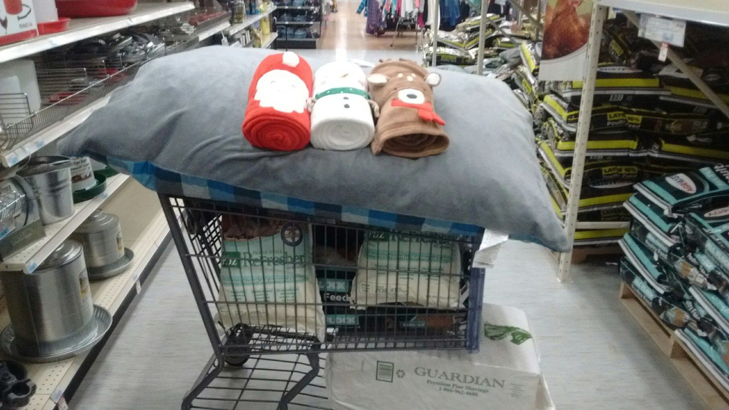 ... 100# of Alflock. 50# Scratch. 50# Sweet PDZ. 100# Wild bird seed. Compressed Pine wood shavings. And as I"m going thru the aisles other things just jumped into my cart. The large pillow is for my Iditarod Team. They can all fit on it and sun themselves.
