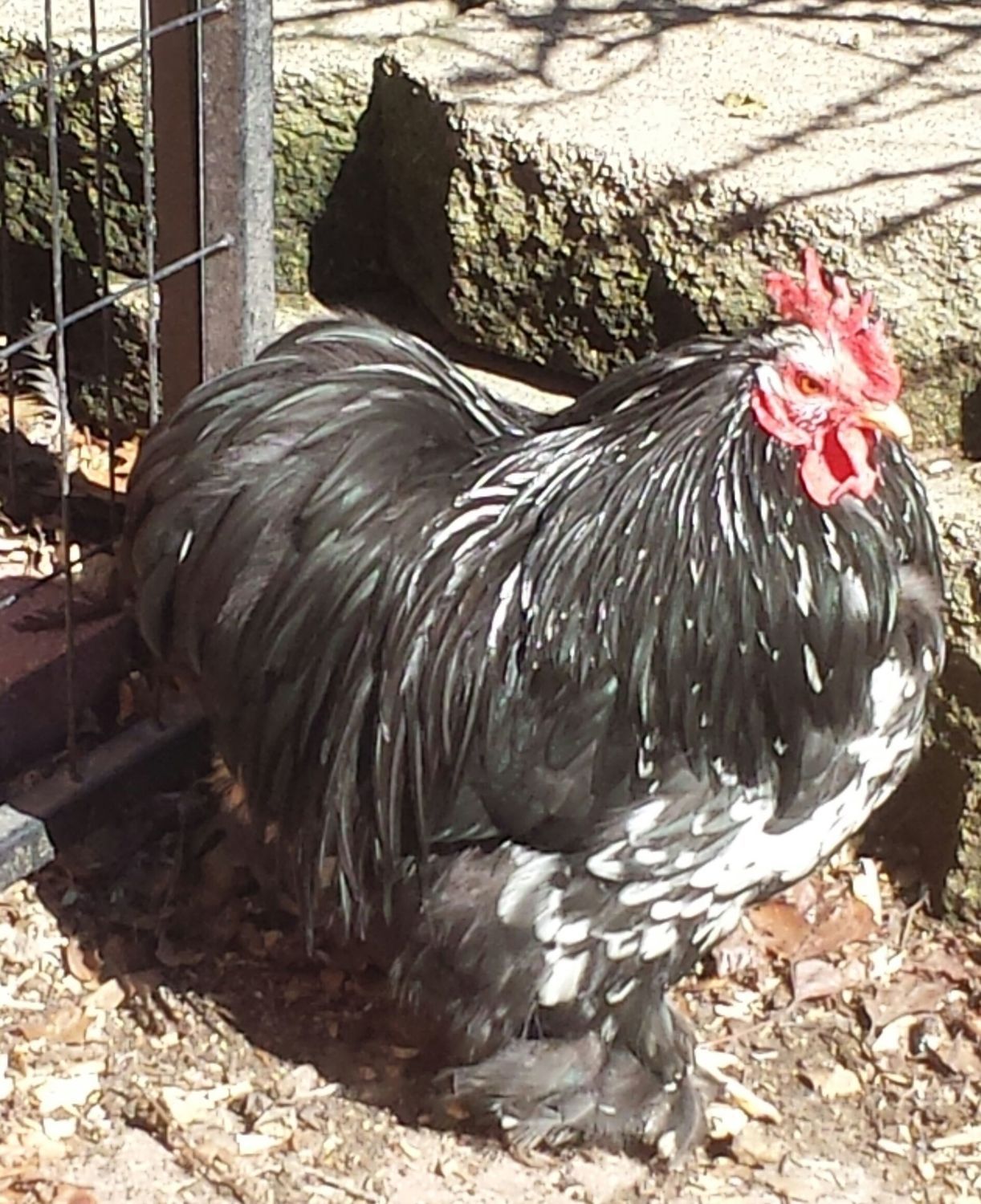 My handsome mottled cochin bantam spends most of his time by himself. This is one of the 2 that have been fighting. Feel bad for him. Perhaps he needs his own girls all to himself. And the other pic is my poor frizzled pullet who is now bald needs a wig.