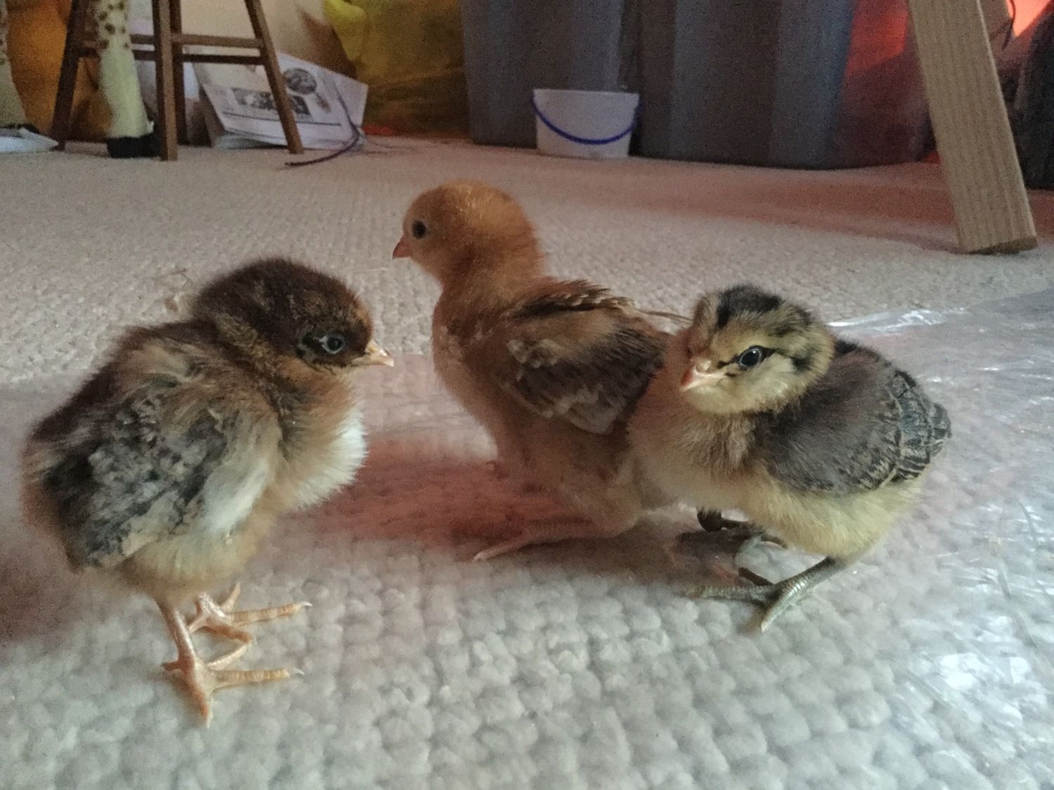 In the foreground is our two week old chick "Chaps". Chaps is a lot smaller than her chick mates about half the size. She has been eating but a bit more tired than the others. Several days ago I notices a small knot in her crop. I have also noticed her running around with a piece of pine shred like it is a trophy trying to eat it like she is hungry. In this photo I just gave her some of her milled chick food with water - she gorged herself and not her crop is soft. Any thoughts from anyone on what to do. She seems to be drinking fine and her waste is softish but normal colored. I though maybe she had a parasite ( to account for her remaining so small) so I got her stool tested which came out fine. Any thoughts on what I should do? I am now suspecting she has a compacted crop but I am not sure. She was born April 16th. Any help would be appreciated we are brand new to raising chickens.