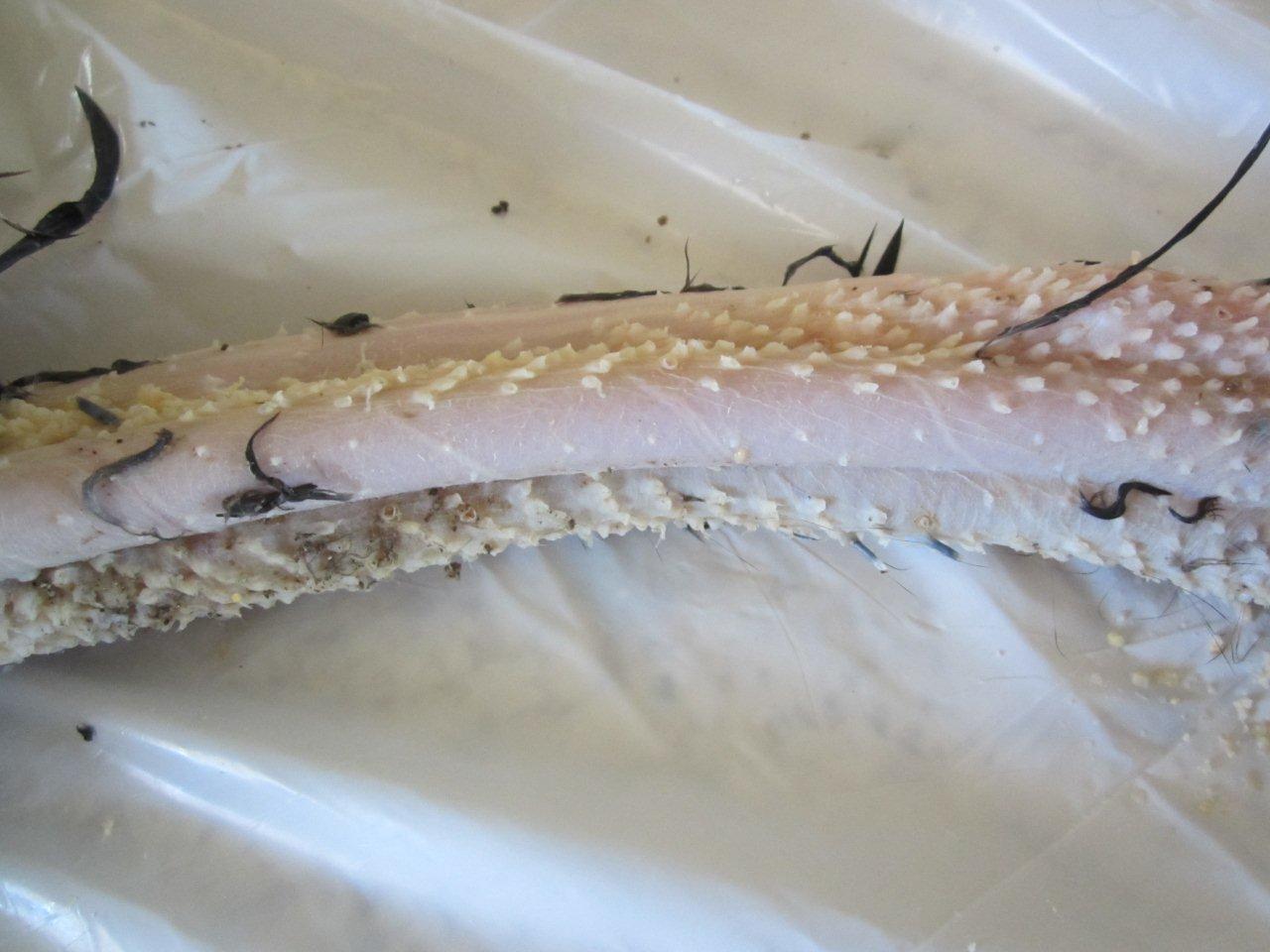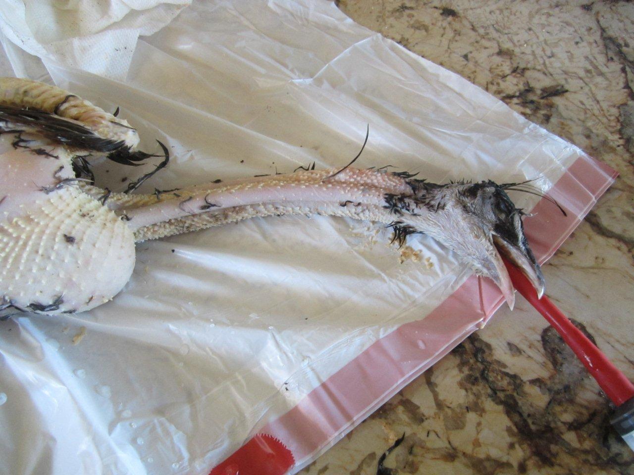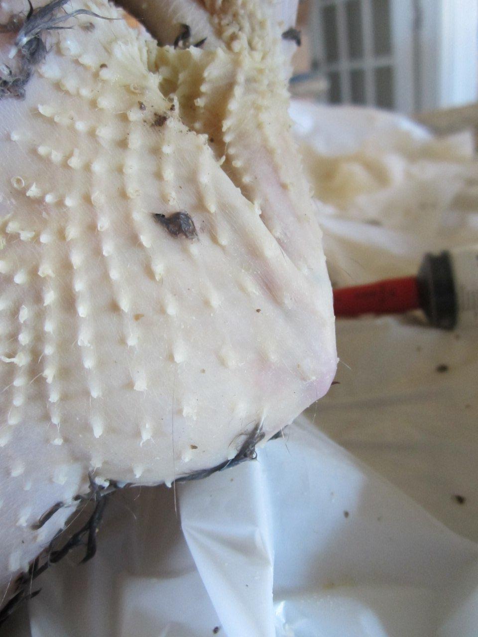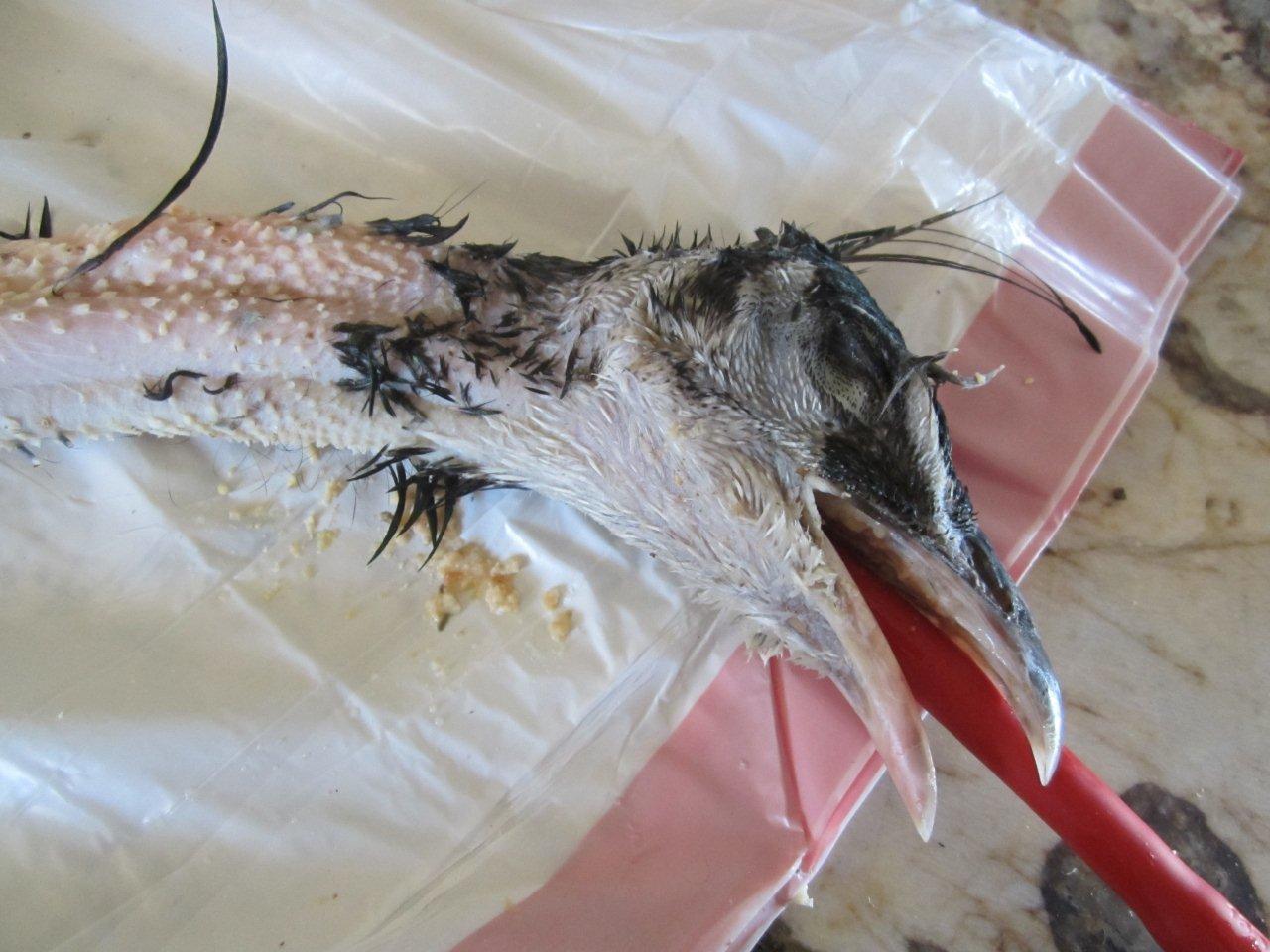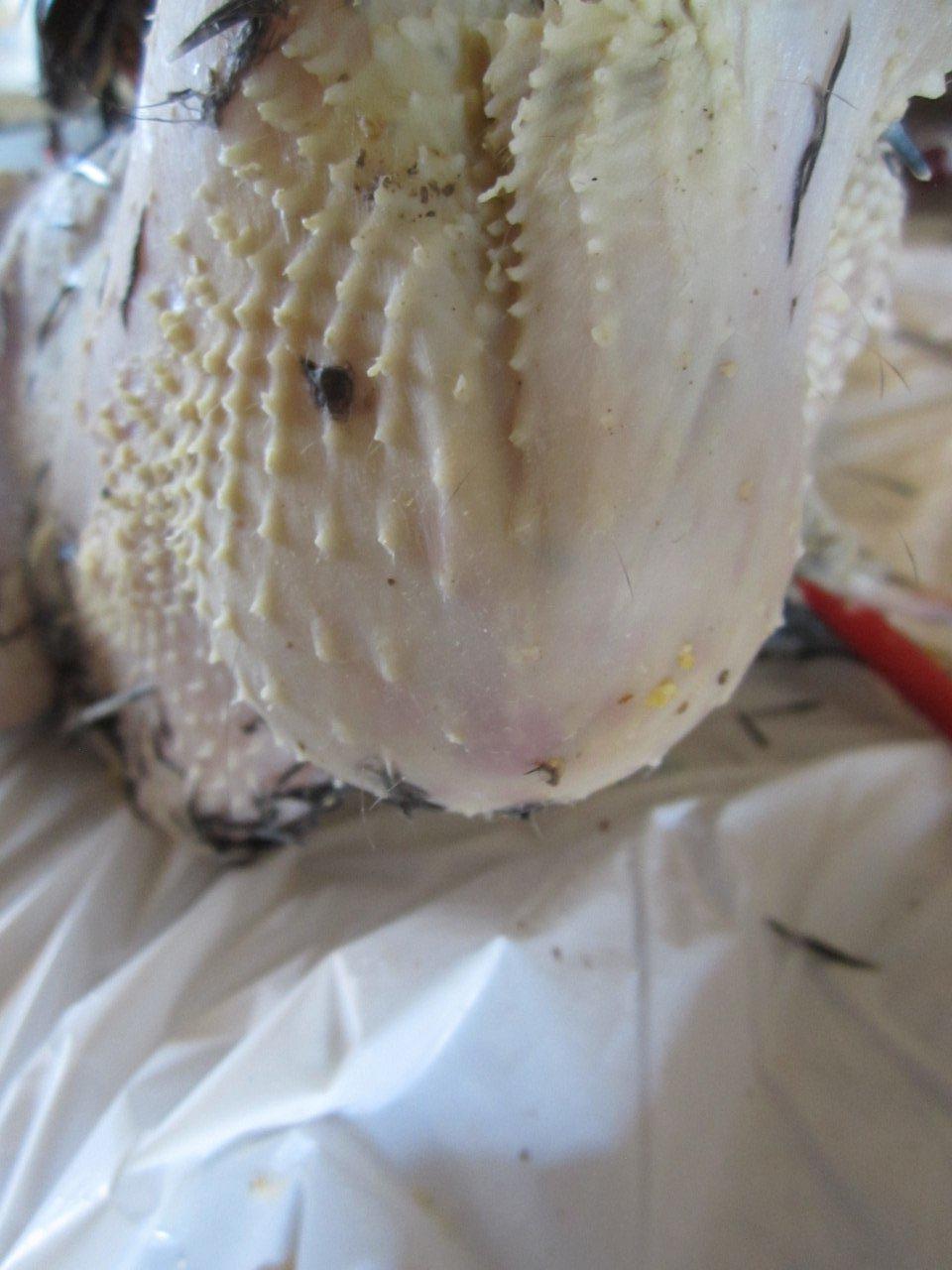 In the spoiler are pictures of a deceased, plucked peachick with a red tube. Do not look if you find photos of deceased animals disturbing. The tube in these pictures is a size 30 french.