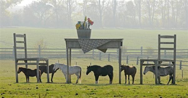 Three horses try to hide from the rain under an over sized table and chair in a pasture near Doellstaedt, eastern Germany. The huge garden furniture was installed by a local wood merchant to promote his products.
