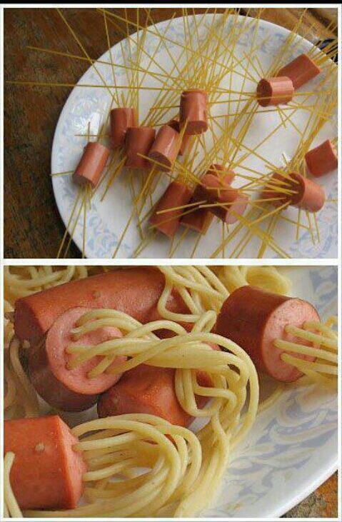 Those are cute but the noodles don't like to cook inside the hotdogs.
