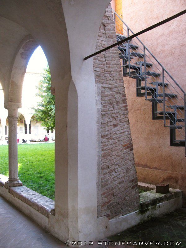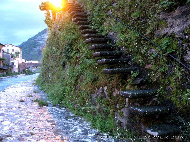 And this staircase goes up from a river to the street above, in a very small town in northern Italy. Just slabs of stone jutting out from the wall, with one broken/missing. I climbed up it right after taking the photo, it was a little wet and slippery, but that just makes it more fun. At least there is a handrail, on the wall side. I don't think it would pass inspection codes in the USA.