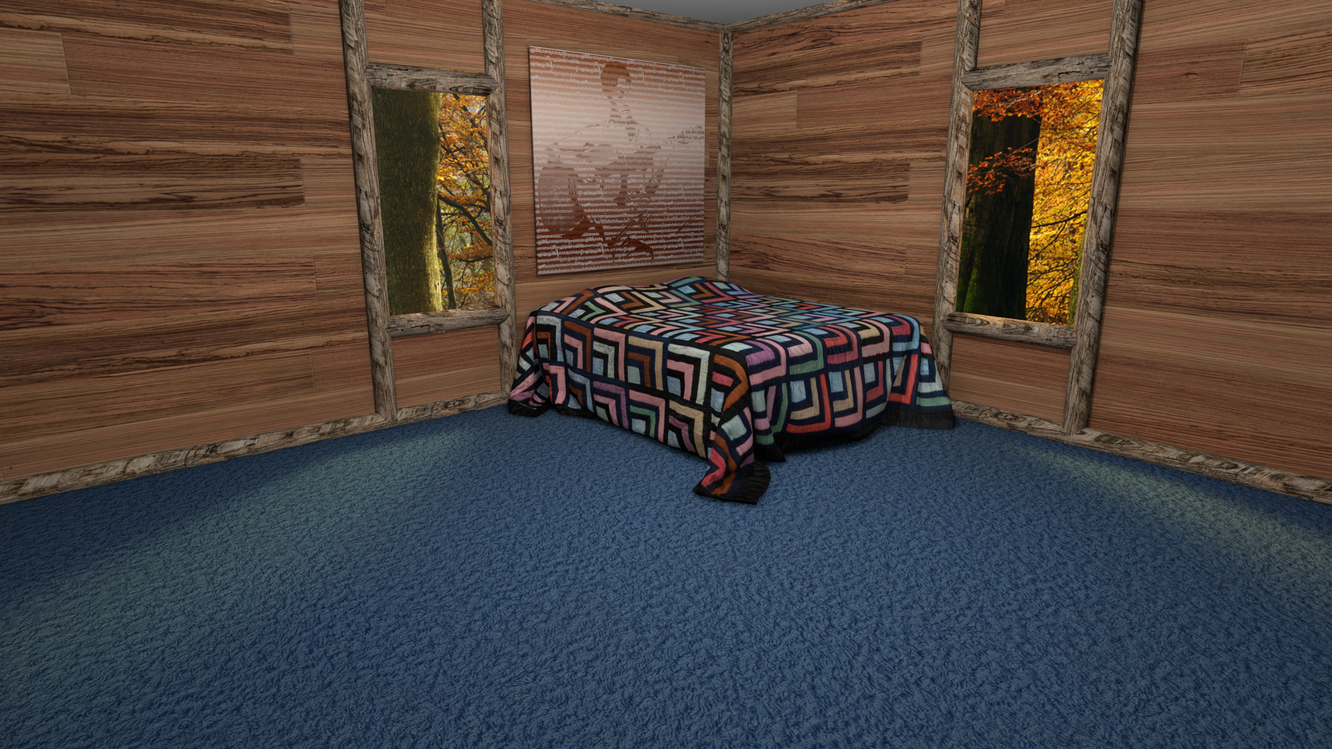 Rounded the edges on the bed. Added windows. Added a sunrise in the woods look for outside the windows. Also played with the lighting a lot...
