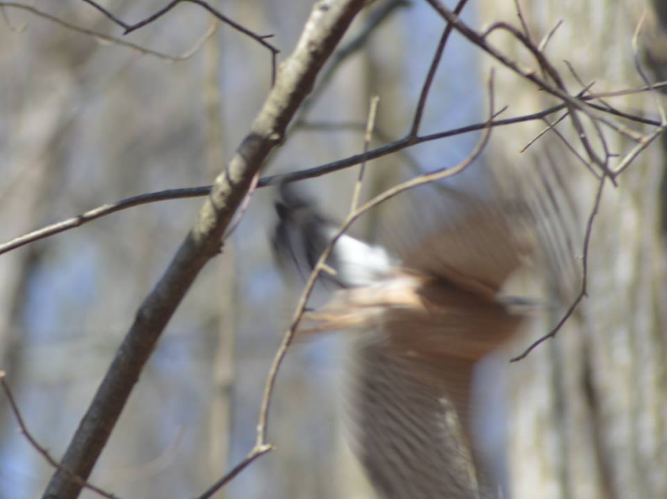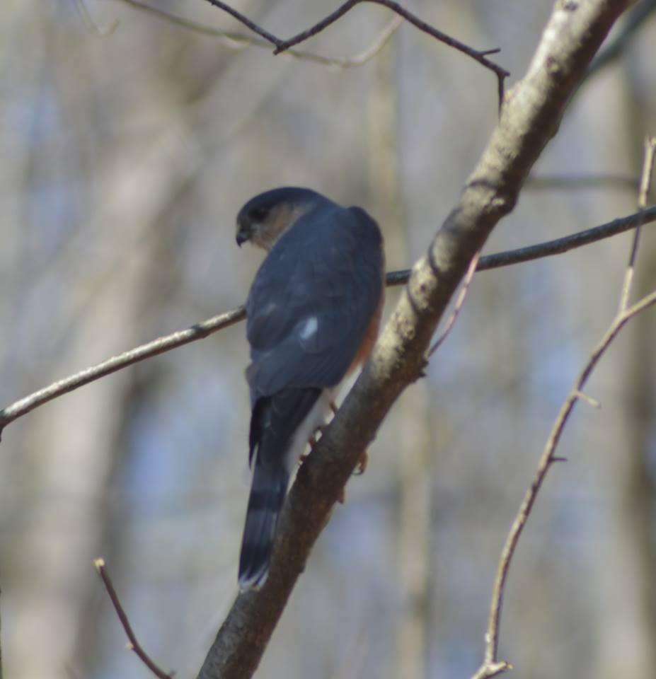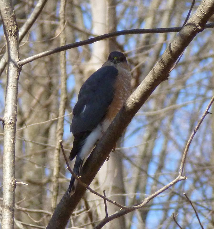 This little Cooper's Hawk has been hanging out by our bird feeders recently. It is not scared by the dogs in the yard or me taking pictures. It was watching the trees around it very intently until it spotted a small bird within range. It took off suddenly and chased the little bird through the trees ~ the little bird did manage to elude the hawk ~ this time. I feel sorry for both the little bird as the prey and the hawk who didn't get it's lunch.