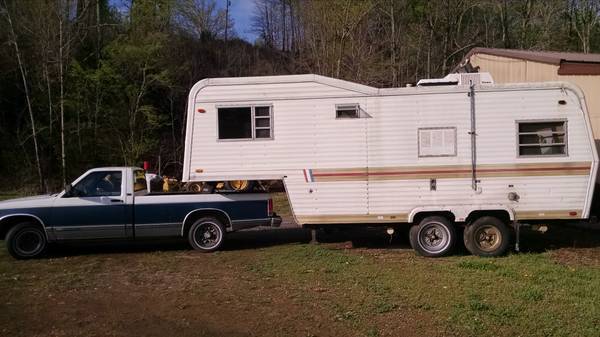 Seriously? On craigslist being sold as a set. 1994 GMC Sonoma automatic (S-10) pulling a 1977 Arabian 5th wheel? You have to have a death wish to pull a 5th wheel camper behind a S-10. That trailer weighs at least twice what that truck is rated to tow an probably has the rear axle in the truck at 150% or better of what its rated to carry. The trailer is on the jack in the picture. Bet it crushes that tiny truck when its hooked up.