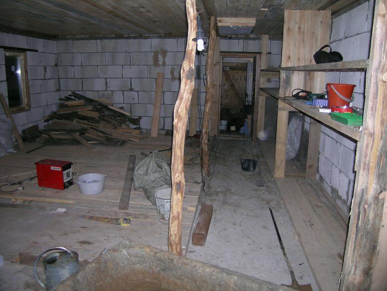 supporting pillars is very crooked, but I do not want to change them, because it is - an oak. In the right corner i will install one big table, one place for washing and one plucking mashine (there will be a partition for working and food making)