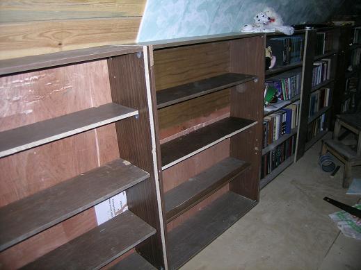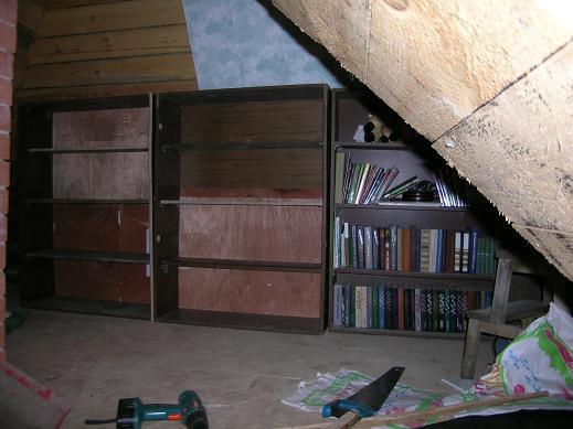 Slightly expanded library in the attic, making a couple of bookcases of old boards. Rear board - it's all from the shipping box, where was a machine for removing feathers ))