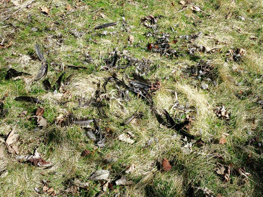 Was in a far corner of my property the other day and spotted this. My neighbor was over the next day, and I took him to see it. Sure enough, it was his rooster who disappeared two weeks ago, victim of a raccoon. The raccoon dragged it a couple hundred yards, across the creek, and onto my property. The roo was a beauty. Sad.