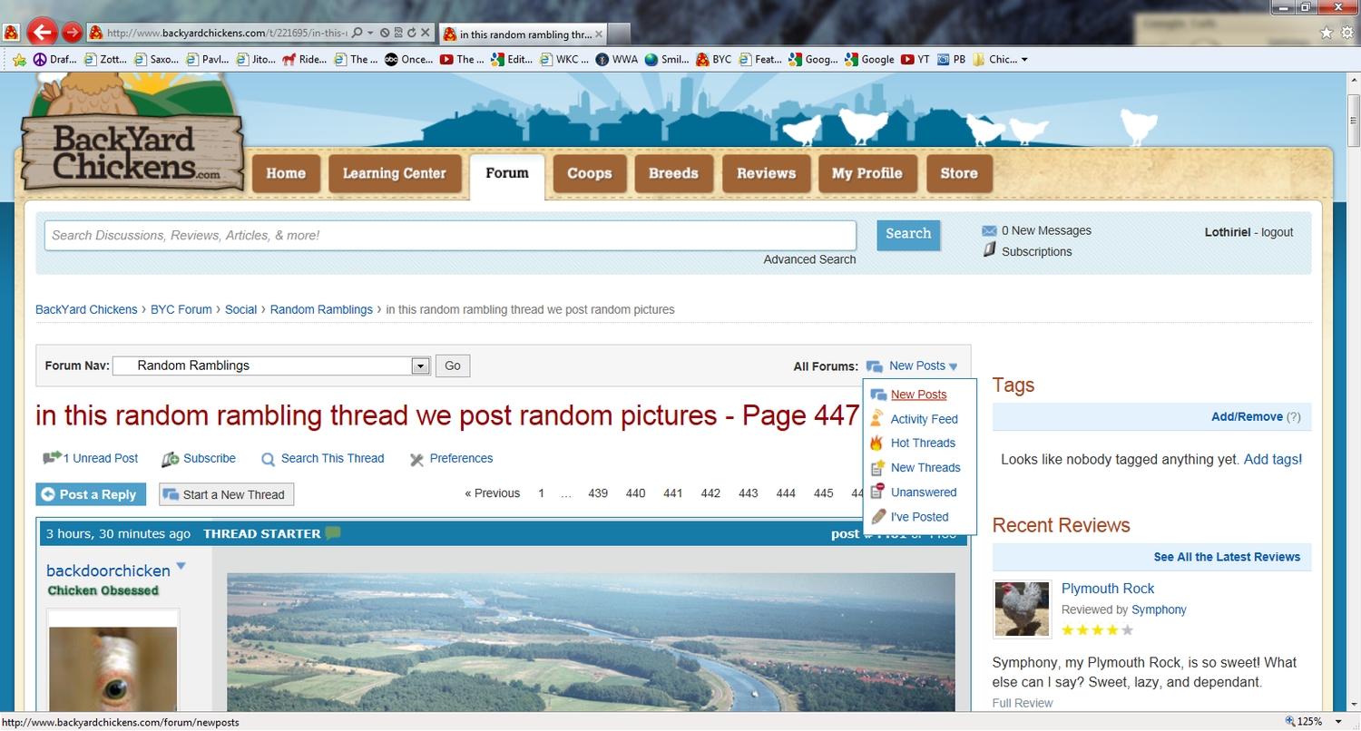 Jan 27, 2012 #4,462 Lothiriel Crowing Premium Feather Member 13 Years Joined Aug 30, 2007 Messages 10,324 Reaction score 240 Points 461 Location New York State My Coop My Coop backdoorchicken said: Quote: This, or this: Click on "New posts" or "New threads" to see all of it, or just "I've posted" to see the ones you've participated in. Click to expand...