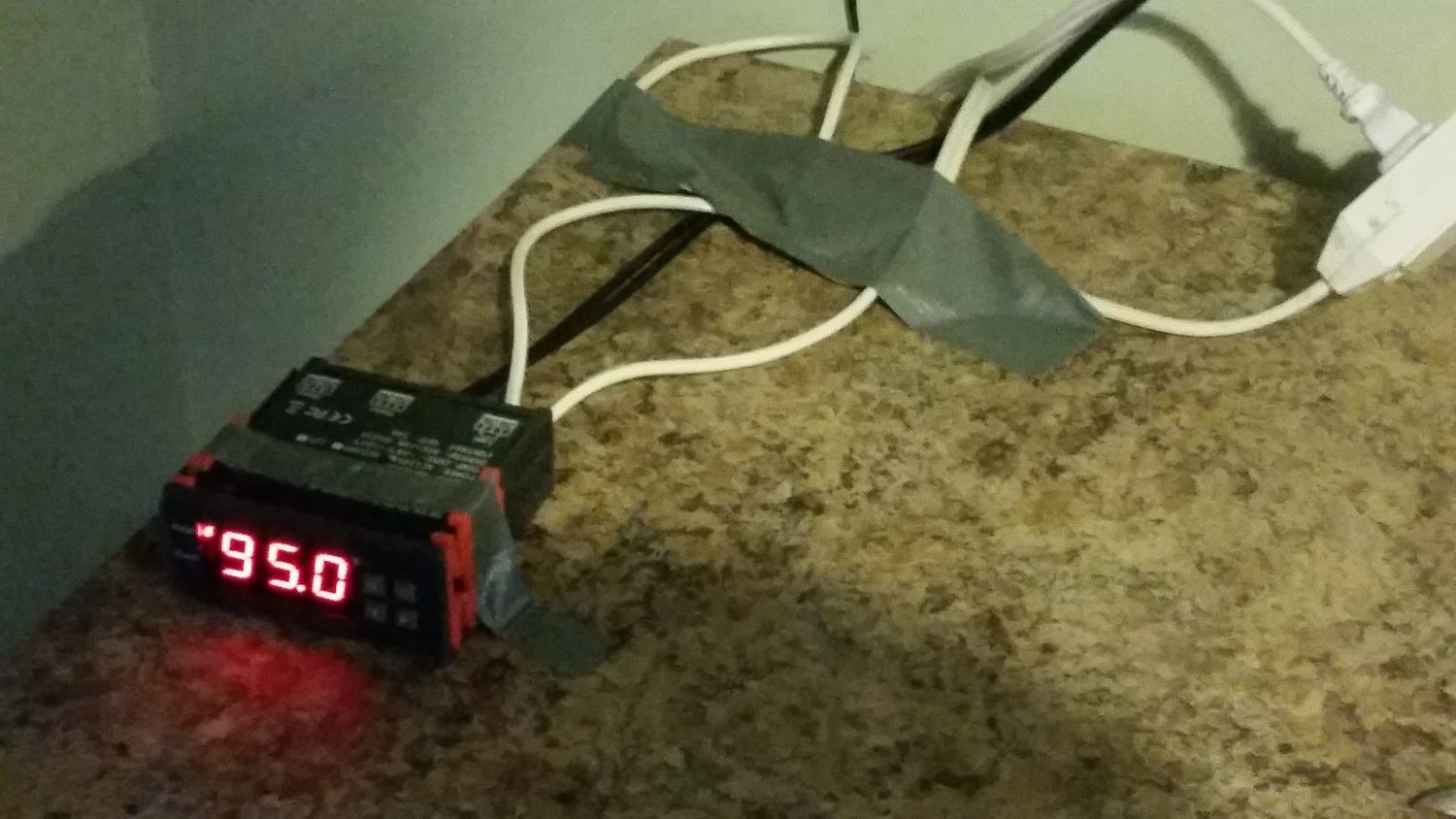 Thermostat 110v wired to light bulb ( do not attempt unless you know what your doing.)
