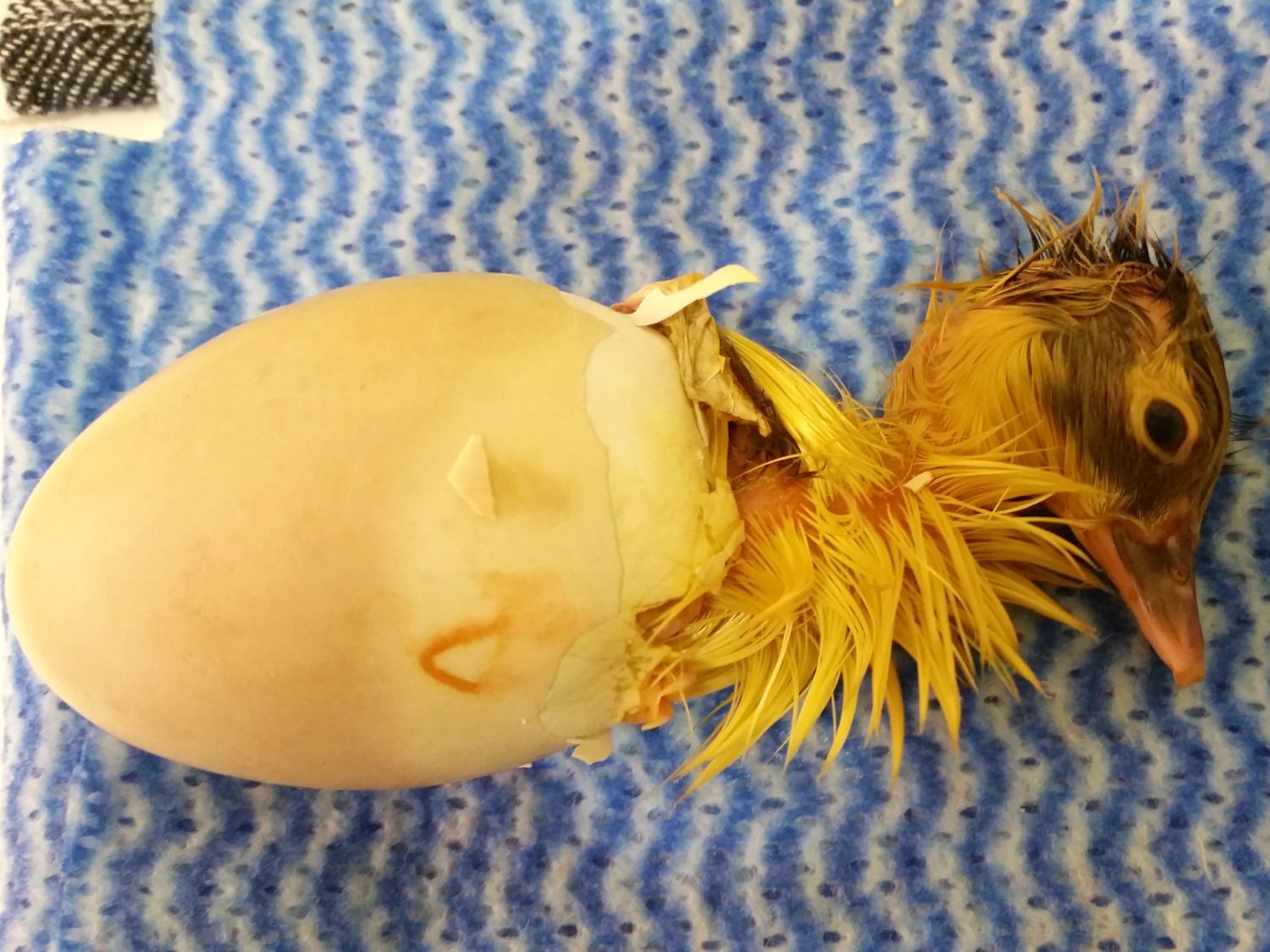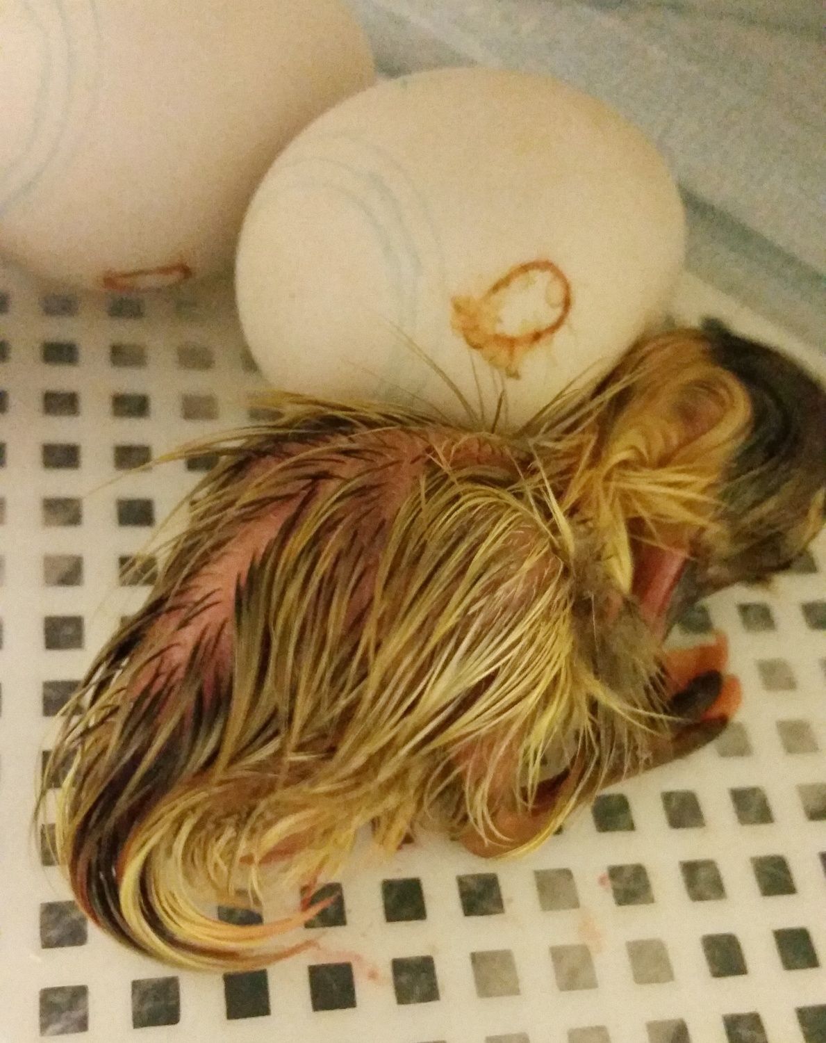 We have 2 external pips, this pip in the photo is from an egg that was the furthest behind! I don't even understand how he's pipped, he wasn't even internally pipped this morning. So it was a surprise to see so much shell broken off from this one! I can't see much movement in the eggs, I would love to check the progress of them all but I don't want to open the bator and risk shrink wrapping![]()