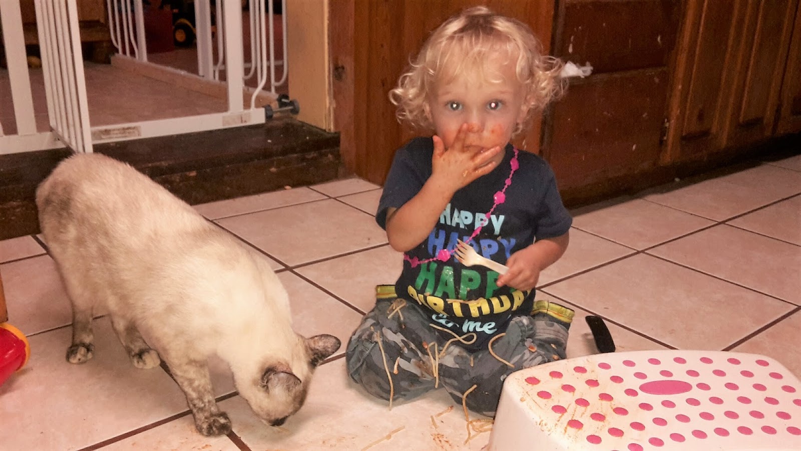 See above. Dogs are outside during meals, or he would throw food to them and never eat LOL he still shares with the cats.Don't you have a dog to clean up after the kids?