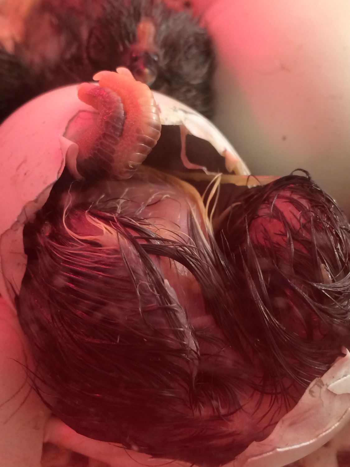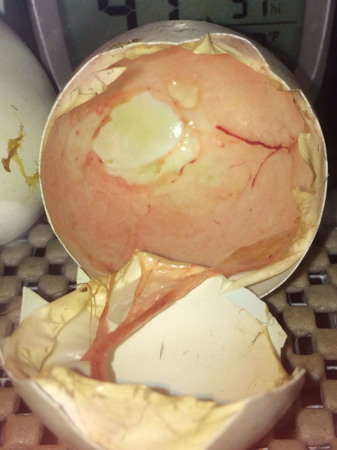Sally, we're not sure. That chick had trouble getting out. Granny thought it looked sticky. The egg was in a weird position; I quick turned her on her side and she pushed right out. This one and the one before seemed weaker than others?