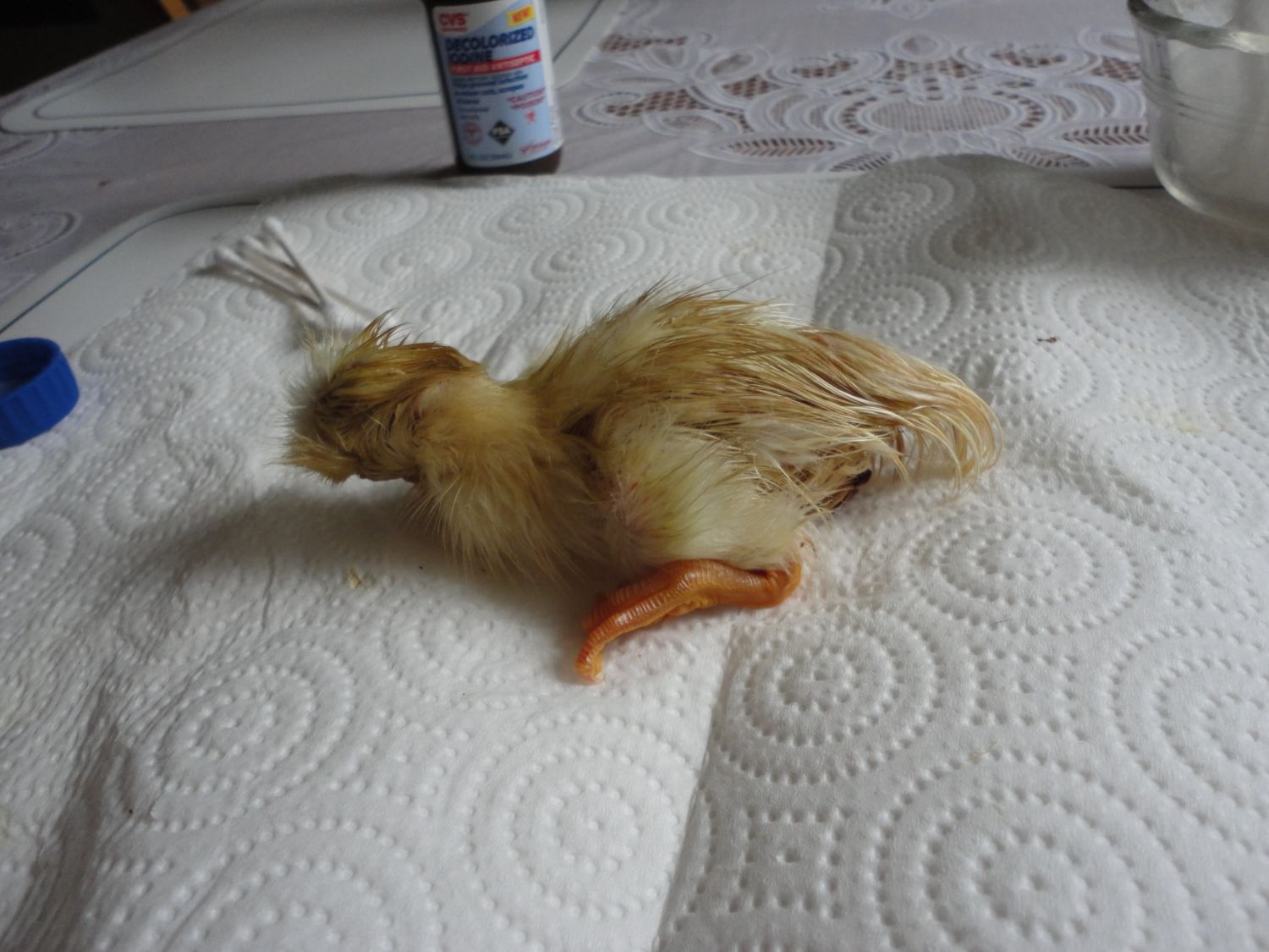 Well, we are still in the ball park. Little one is looking a bit better, but still a long ways to go. I did put a couple of drops of water in its mouth and this afternoon I will do the brown sugar water, a warm running water bath, a gentle hair dryer fluff and some more iodine. Not all of the yolk has been absorbed. Maybe it just wasn't meant to be for this little one, but I haven't gave up yet.