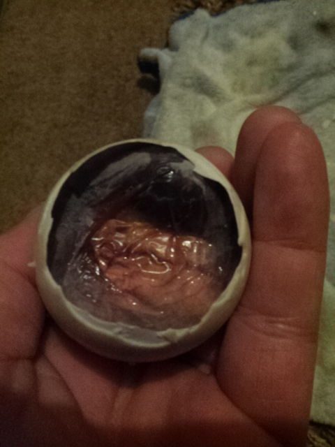 I bit the bullet and took the top of the shell off (we're at day 38 now). It looks as though he is upside down but I really don't know. The yolk sac is at the fat end and a few big blood cells are still there under the inner membrane so I've moistened them and have it sitting that end down on a moist cloth.