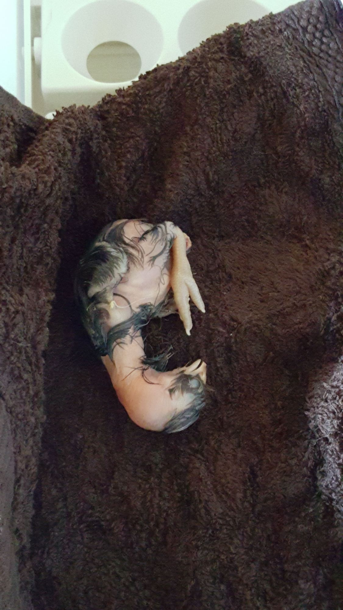 Here are a few pics of her.. she is still in the incubator on a warm rag.. should I keep her in there or take her out and put her under a lamp so she can dry out?