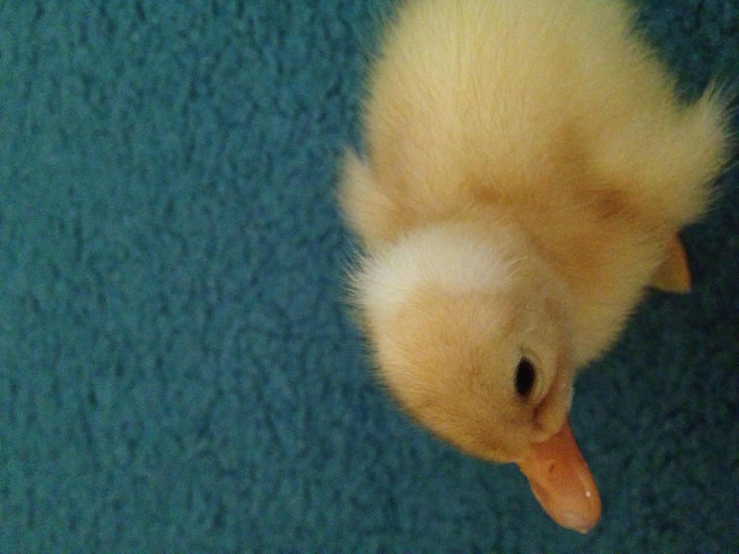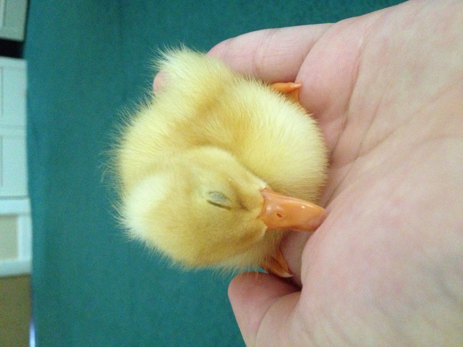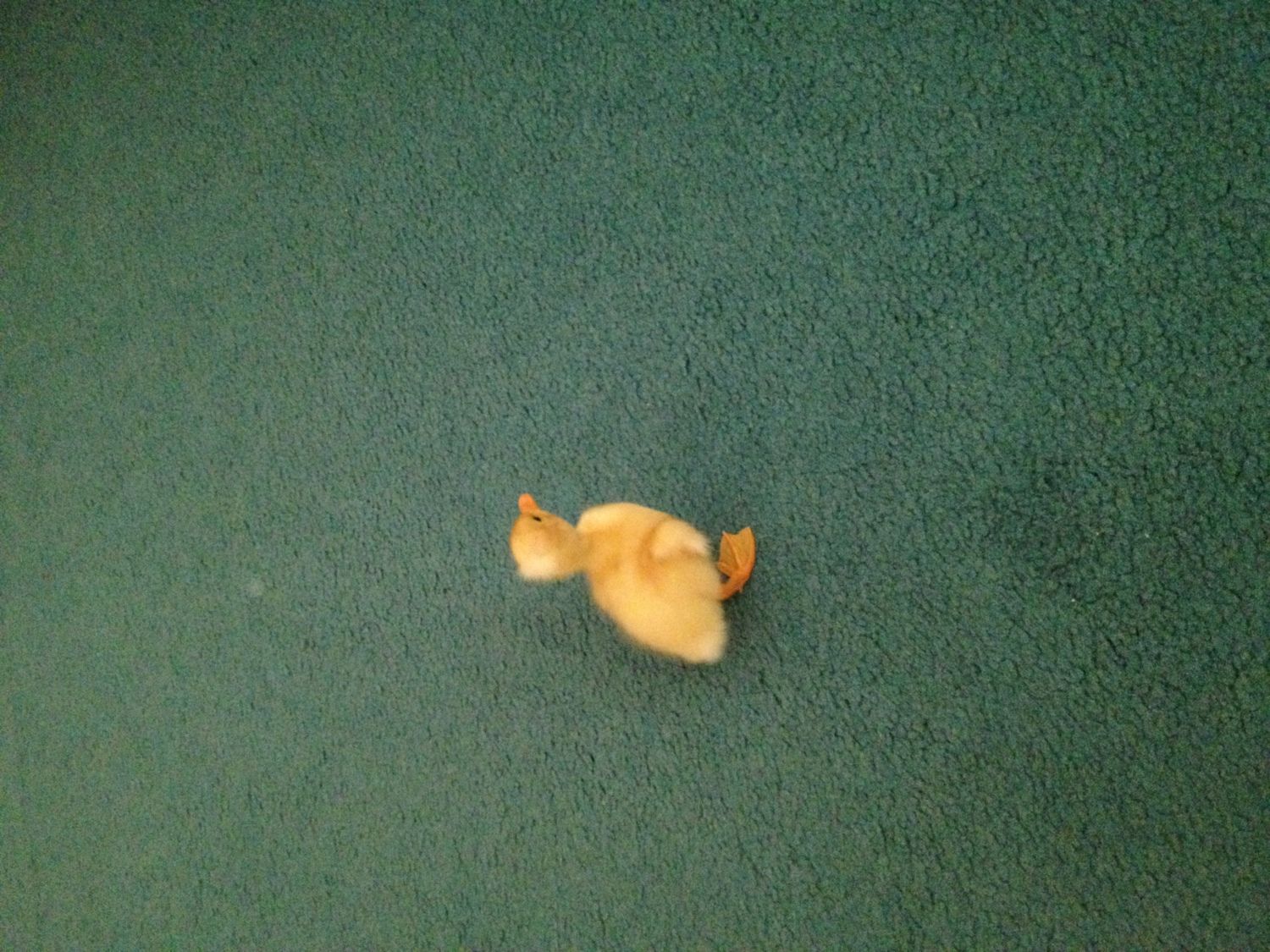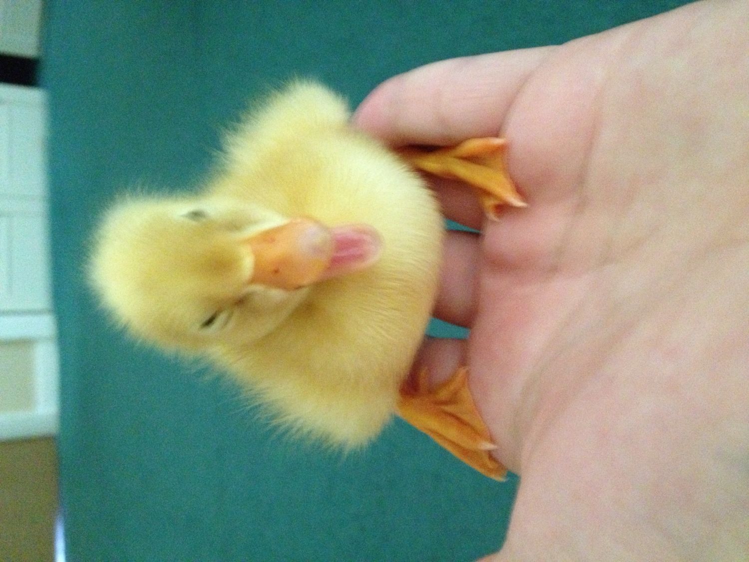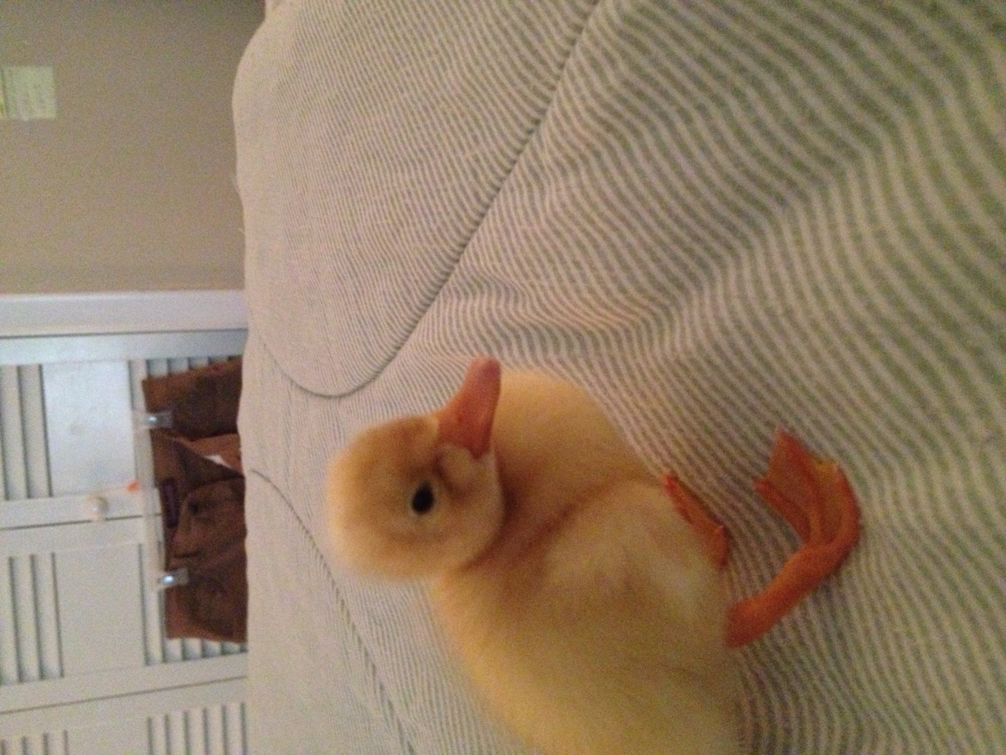 He can swim now in the sink as long as you are right there to make sure he doesn't jump out and doesn't tire out. just put enough water in up to his body, then when done wrap him in a towel and right back under the heat lamp. Some say wait but Mama duck takes hers right into the water. Sure is a cutie!!