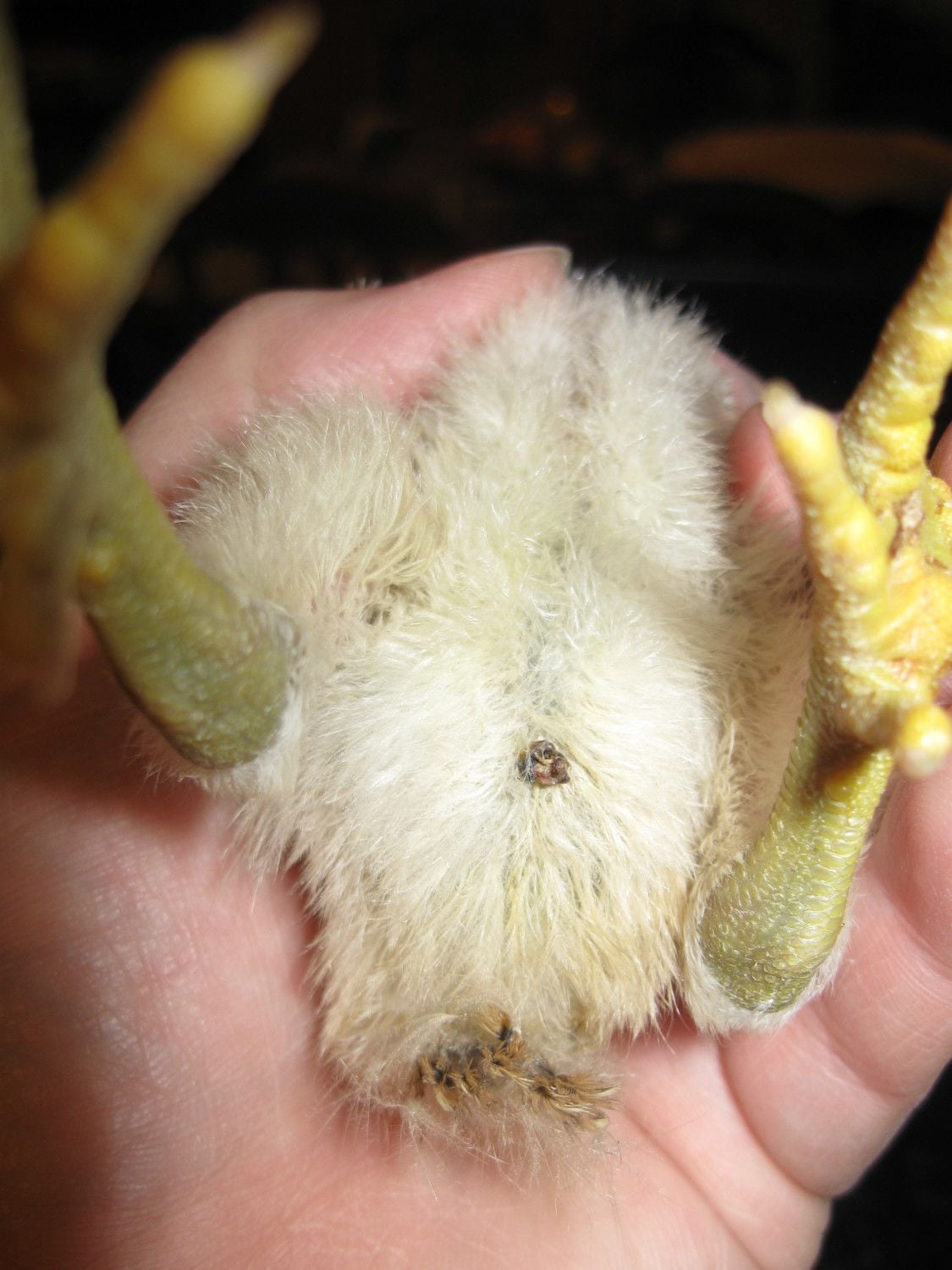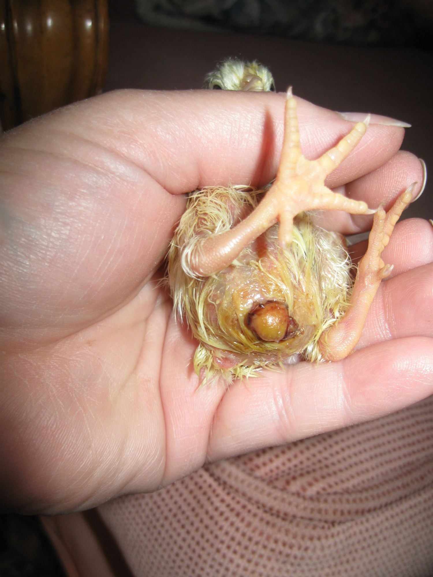 CHICK #2 We call this one MIRACLE, b/c it's a miracle it's alive. This one was trapped in a shell for 24 hours after it started to zip. It was fused to the shell & required assistance.