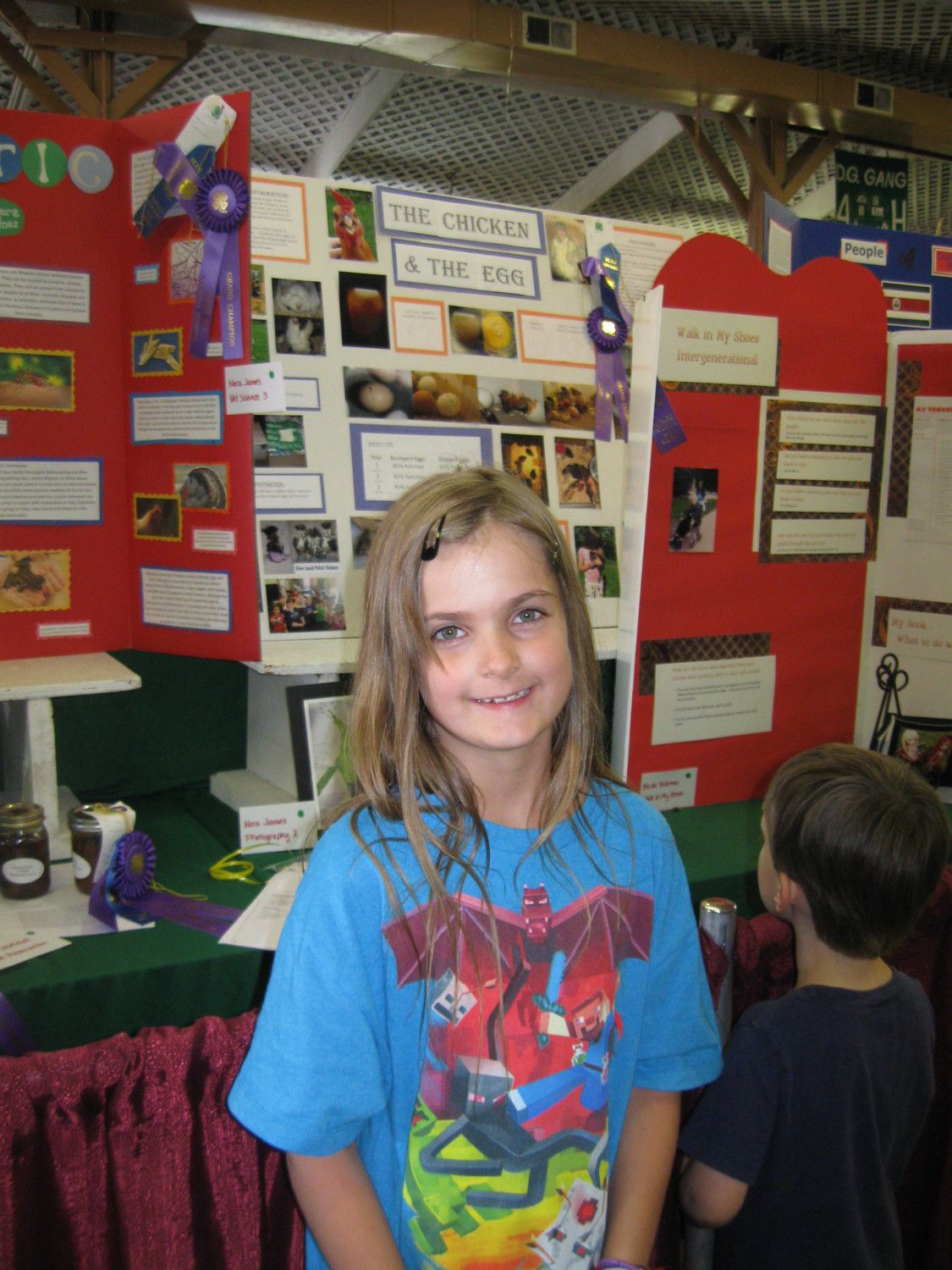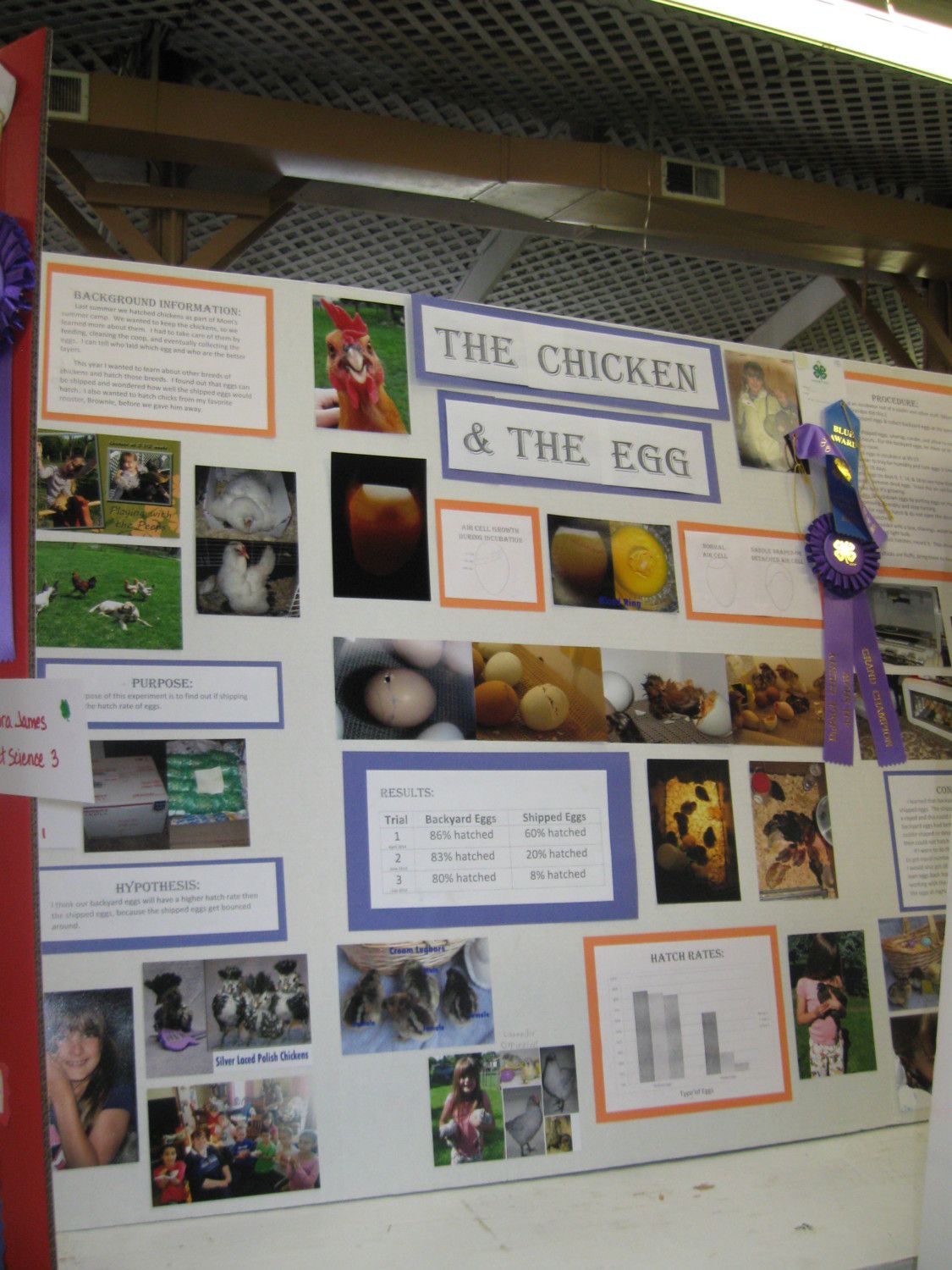 My daughter won a blue ribbon, Class Champion, & Best & Show for her 4H project comparing hate rates of shipped eggs to backyard eggs. She's 9 (listed as 8 b/c of when her Bday falls), so the state fair is not an option. As a teacher, I made her follow the usual sci fair format. I also made her type everything for a professional look. When the judge asked her about how she calculated the end results, she pulled out her binder showing her candling data tables and detailed hatch records. I'm so glad the judge asked because once this shy girl got talking, she was able to demonstrate her knowledge.