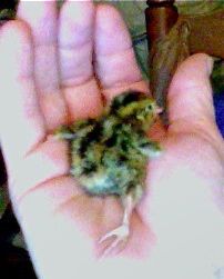 I have 7 QUAIL! They weren't supposed to hatch until Friday. I was moving the 4 chicken chicks (one week old) to the larger brooder and was going to clean the aquarium hatcher/brooder out for the quail hatching on Friday. I heard peeping coming from the incubator and I already had 3 with more zipping! They had jumped down from the turner! I quickly put the two egg trays on the floor of the 'bator. These are Cortunix of mixed colors. One is yellow, 3 are dark with light faces and bellies (tuxedos I'm guessing) and 2 are yellow and black striped. The 19 bob eggs don't show signs of hatching yet but I wasn't expecting them before Saturday. That leaves about 15 Cortunix eggs left.