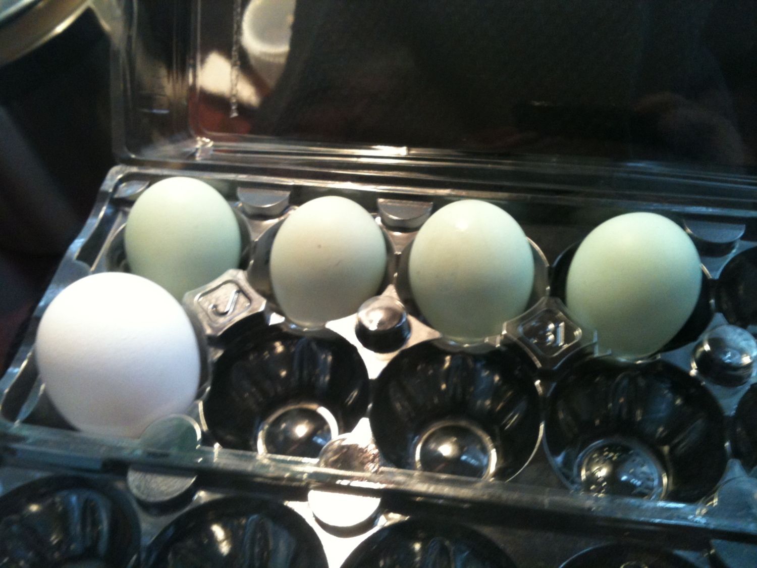 Aretha, our 19-week old cream legbar has laid 5 eggs in her first week. We couldn't be more proud of her hard work. The eggs are still small though, so I hope they get bigger soon. Here's a picture of her first 4 eggs, with our last grocery store egg in the carton for comparison.