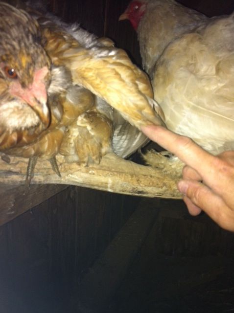 Went to lock everyone up tonight and could find my 1 LF chick. She has 2 mommies!! So of course they are both not laying. So I could hear her chirping but could find her. Look for the little butt in the pic!!!