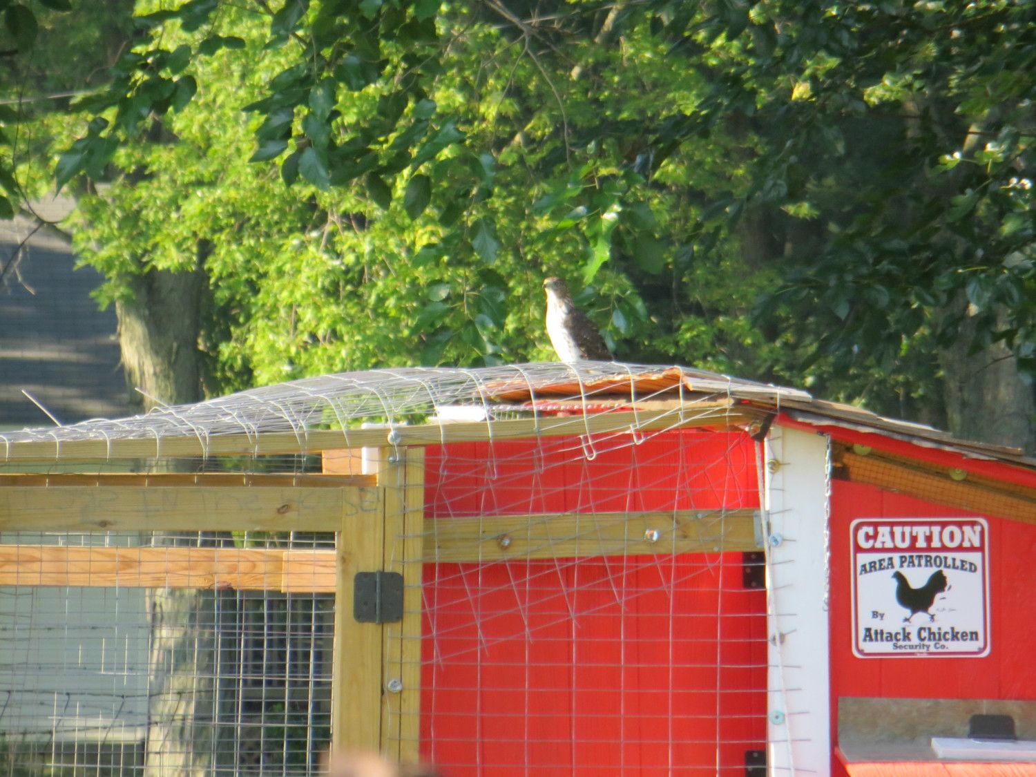 So, I was just looking out the window and saw this thing of beauty land on top of our coop. Either an immature coopers hawk or a sharp shinned hawk. The eyes are not red like an adult cooper, but are dark like an immature cooper. Looked more like a cooper to us. It walked all over the roof, then landed on the ground and walked around there. Finally we got too close and it flew away. I'm hoping it learned that it can't get into Fort Chicken. So glad I spared no effort to make our chicken coop/run secure. What a perfect, sunny day it is today!
