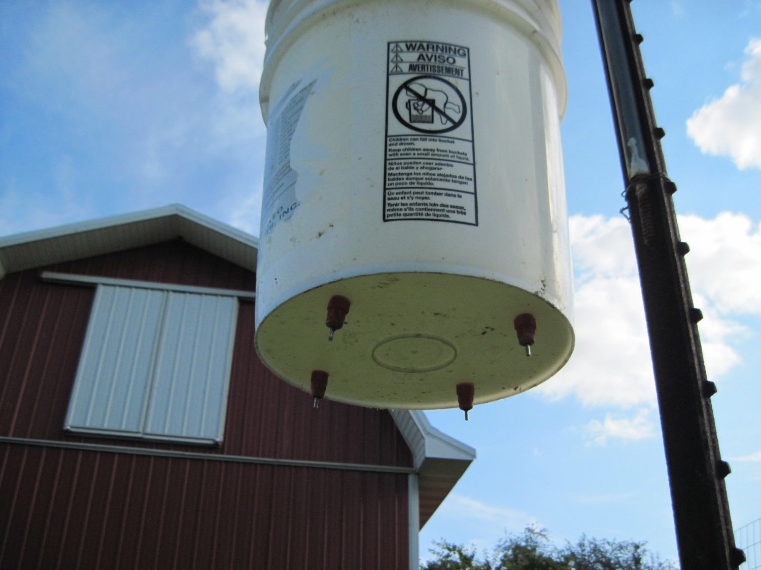 Note the rope length adjuster. Use a bucket with a wire handle (bail). Plastic bails will eventually crack and break. Any chicken standing under the bucket when this happens will also break.
