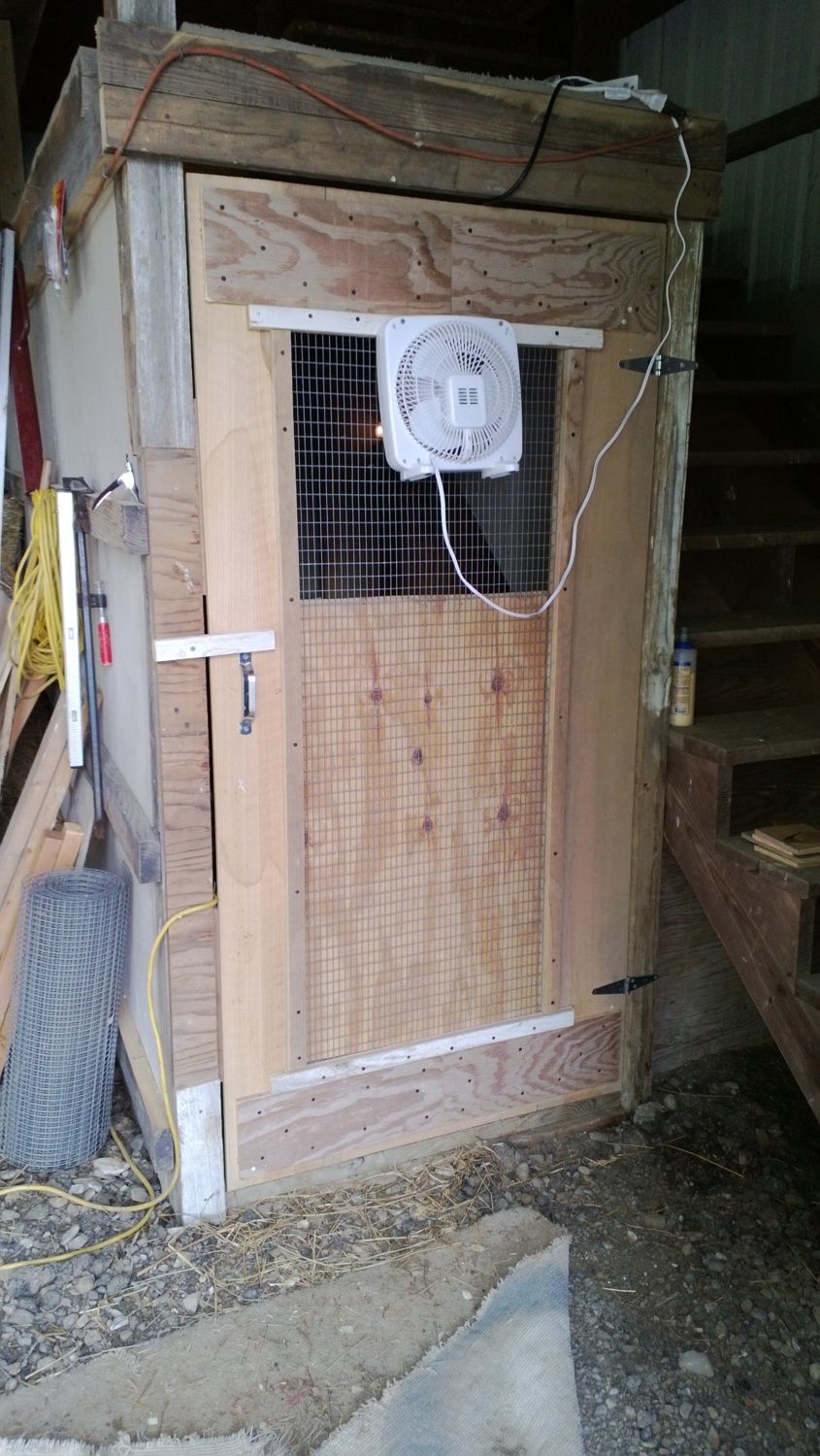 John, I can see that fan isn't quite level. Do you think the birds notice? Next time, get it right, they do notice and I've heard about it thru the chicken squawking in my back yard. Chicken news travels fast that way.I bought a $10 fan from Wal-Mart and drilled a couple of holes through the case so I could screw it to the coop door with long drywall screws. Every so often, I scrub off the dust with a broom. It has been going all summer. If it breaks, I'll blow another 10 bucks for another one.