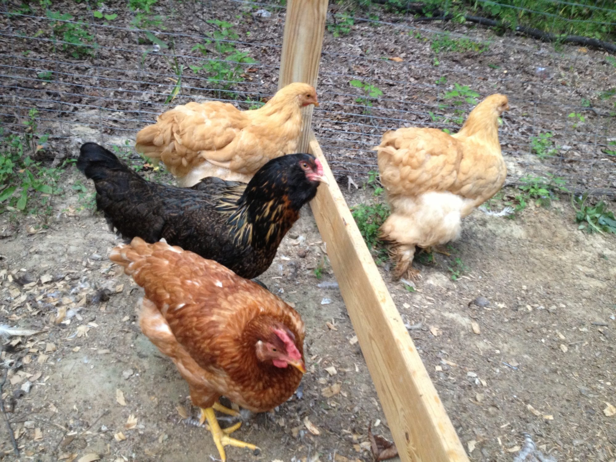 These pretty ladies are my Lucy (red sex-link), Nutella (EE), and the two fluffy cochins. I have three, but the other doesn't want to be seen with the first two. They were checking out our work.