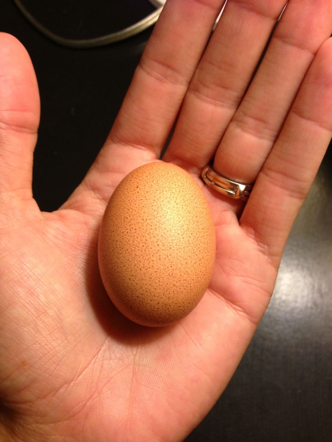 I finally get to join the club! Found this last night while tucking in the chicks. It was right outside the nesting boxes, so I'm hoping the next few actually make it inside. It's so tiny and I absolutely love it! I think it was either Wanda (BR) or Lavon (BA), but I can't be certain. They seem to be the most mature looking of the group. Hopefully I find another little surprise today! [COLOR=B42000] [/COLOR]