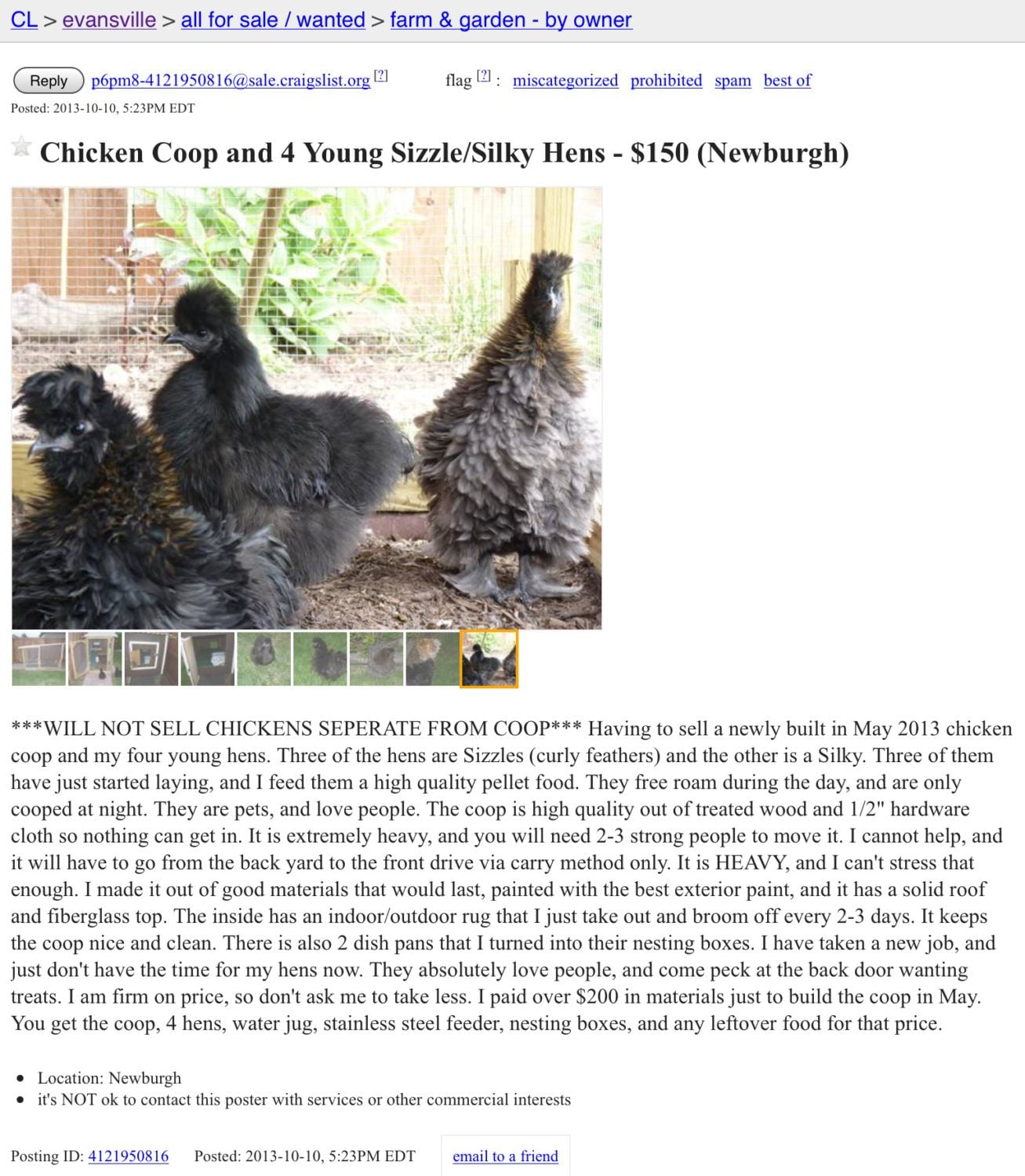 I just ran across this ad on CL and I wish I could get them! The price is great and the chickens are adorable. I love the Sizzles!
