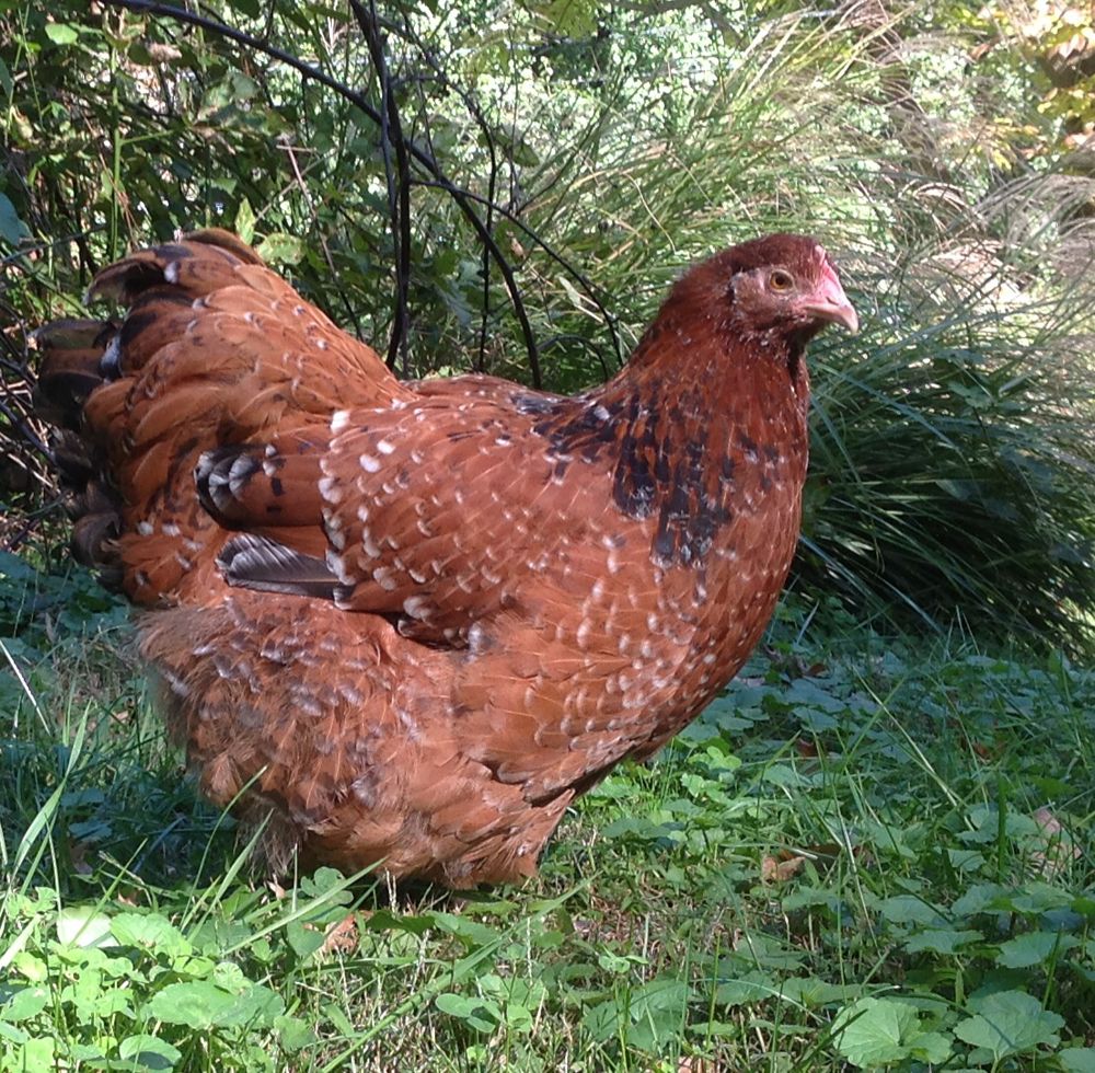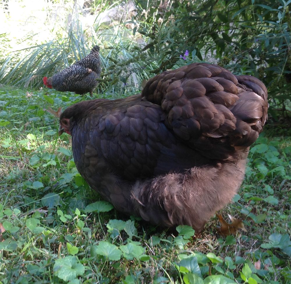Bonbon, English Chocolate Orpington ~ Bantam (Adeline's fluff in background)