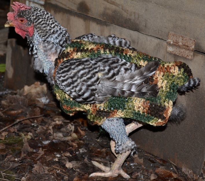 Oh, that wasn't Kate, that was Cricket as well. She has the most miserable molts, poor thing! That was actually in January, so she did start her molt early this season. Here is last molting season's style:[COLOR=A52A2A]pipd ~[/COLOR] [COLOR=8B4513]My BR, Tweedy, commented that Cricket's crocheted sweater is certainly an improvement over your BR Kate's pink polyester housecoat, but that BR Cricket should consider a houndstooth tweed that would complement her natural coloring. Tweedy also said that Cricket's autumn colors should now be replaced with festive jewel tones, which would be striking with her graphic display of black and white. You had better head to the yarn store, pipd! Just joking with you! [/COLOR]![]()