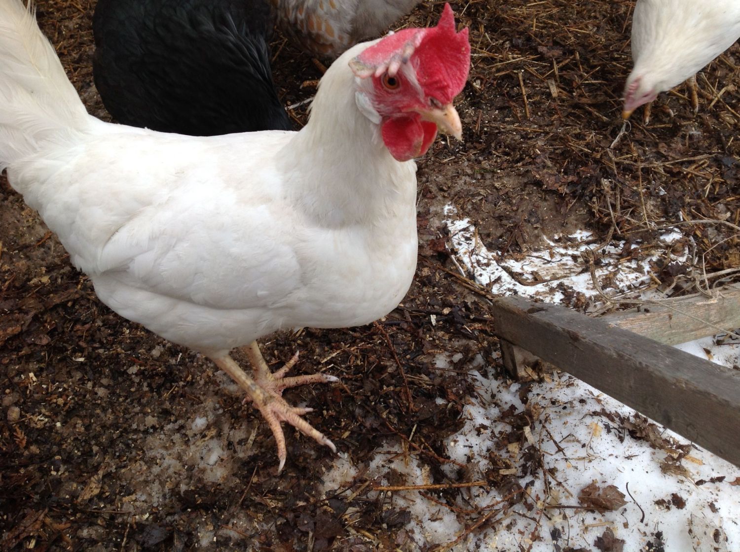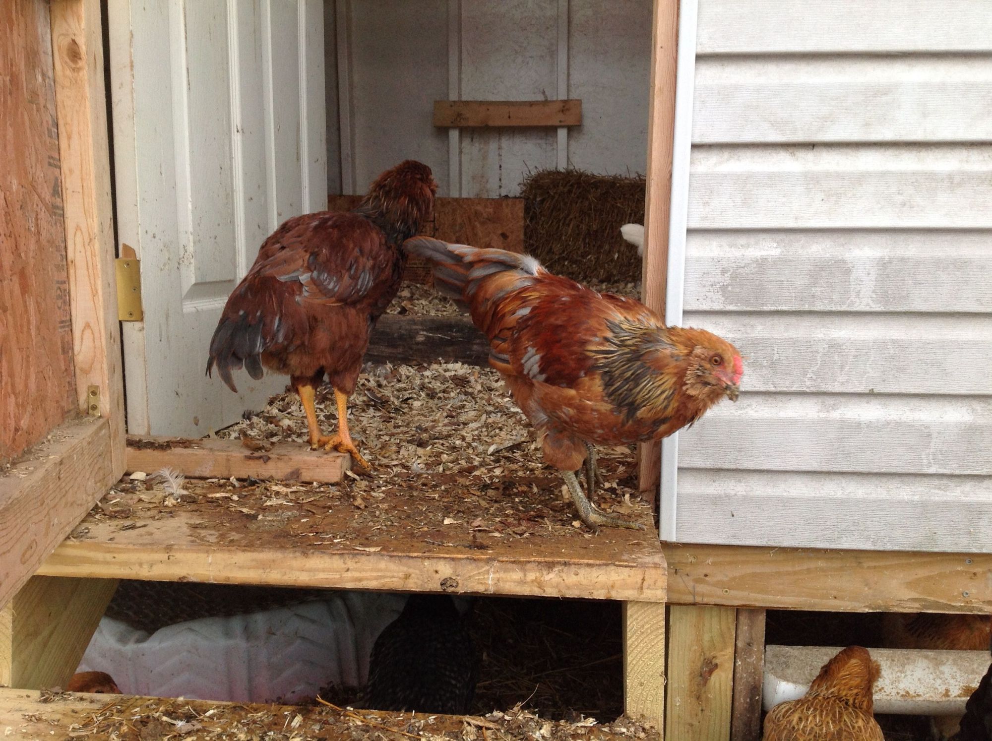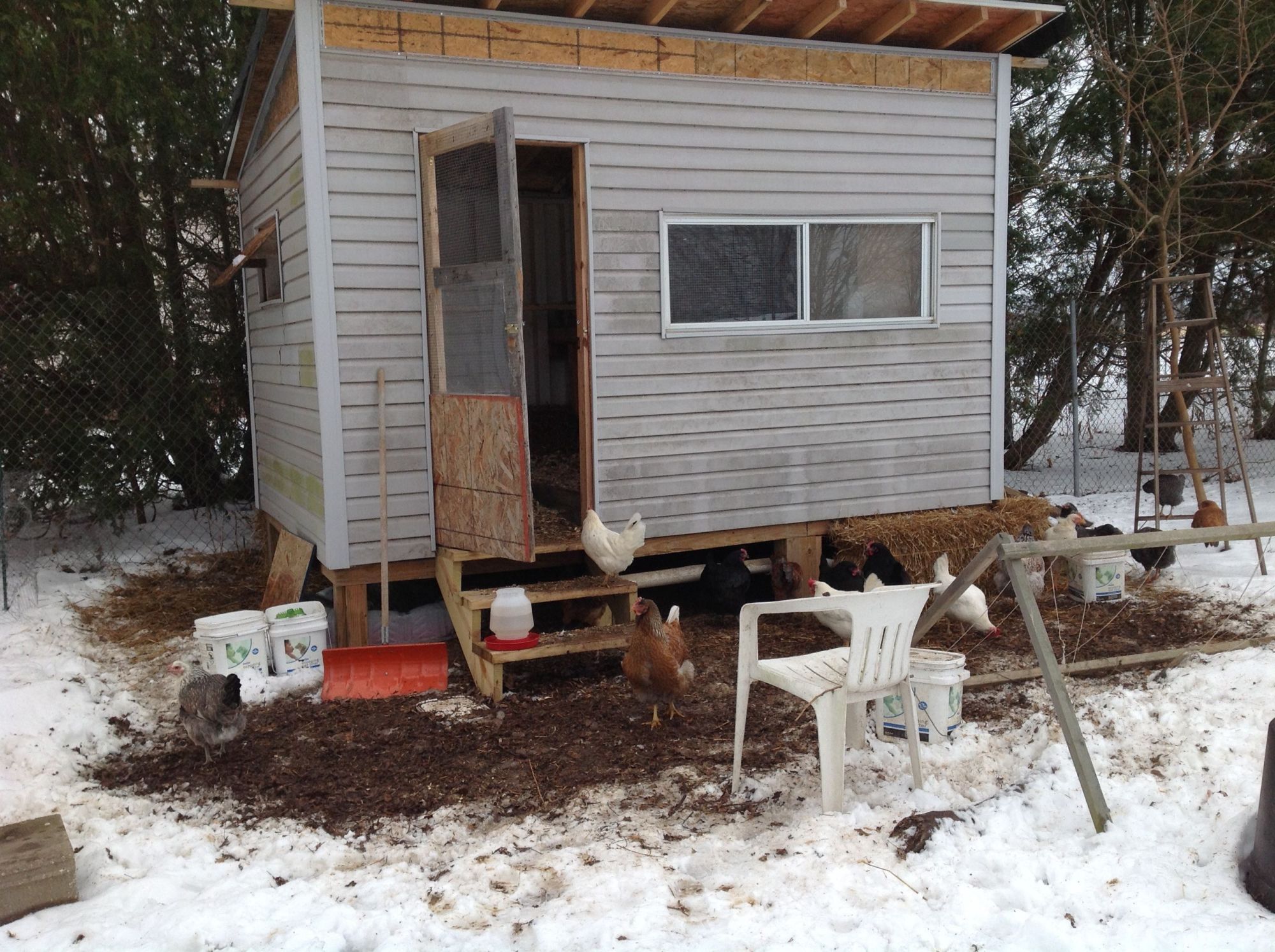 Are the whites leghorn? I love the combs when they tip over, adorable!Ok here are some pics of my coop. I left the top row of siding off I case I needed to cut some openings for ventilation. Boy, it sure looks messy with all the melting snow, but here they are.