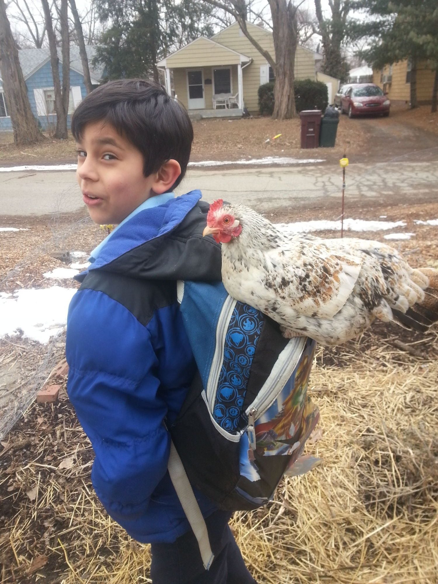 This my son and one of our rescued chickens. This bird LOVES to be held. She follows us around like a dog. She has really deformed feet from the cruel way she was kept, but it doesn't stop her from hanging on to hoods, packpacks, hair... whatever