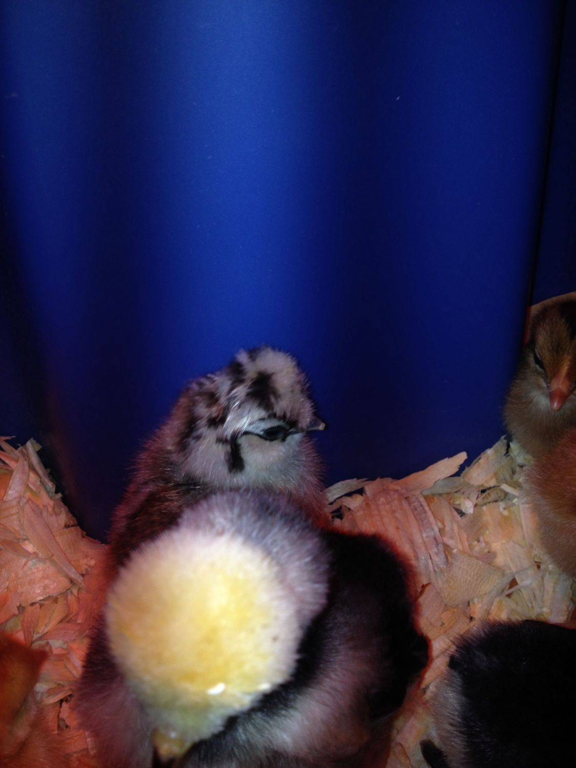 I have a few crummy, out of focus photos. I can identify with chick rookie whose new chicks are wild. My chicks typically act like I'm one who can't be trusted even though I wait on them hand and foot, clean up constantly, feed them, make sure they have toys and their favorite channel during TV time lol, and have let them have dust baths that have resulted in the room being coated with dirt. They have calmed down since I started feeding them live mealworms or small crickets from my hand each evening. I sit on the floor and lean down so I'm not so Godzilla-like, but they still find me untrustworthy.