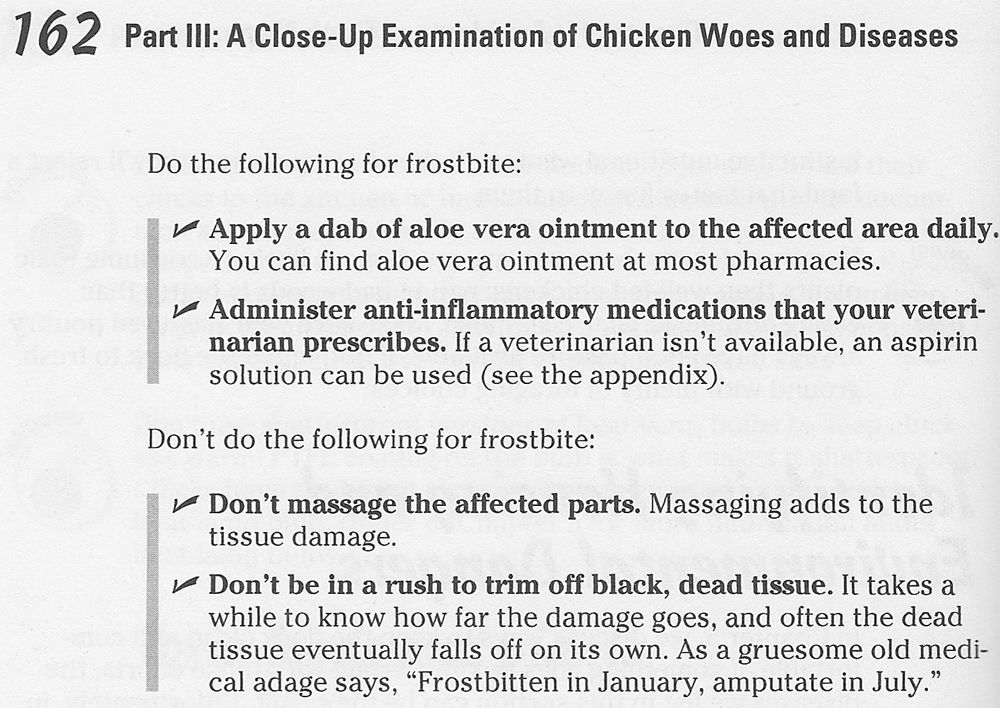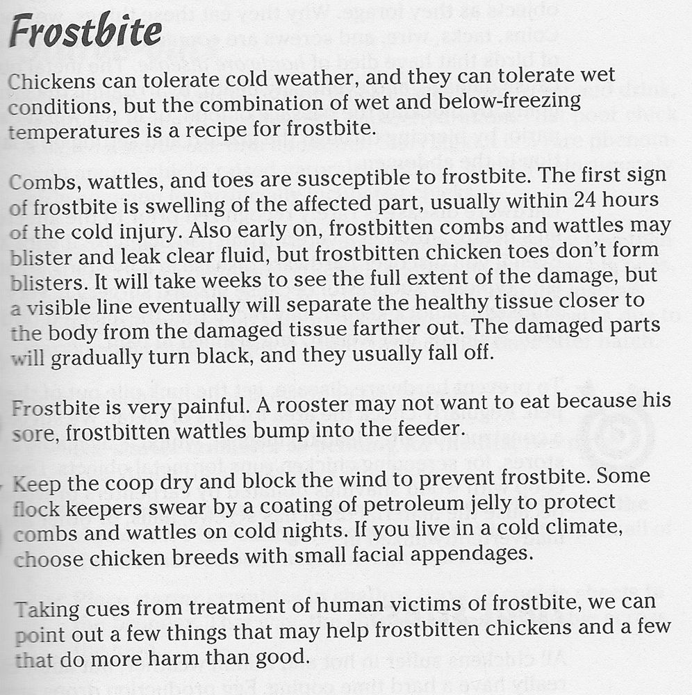 FlockMaster ~ I'm sure Leahs Mom gave you a good source for further info. Here's some info from my Chicken Heath for Dummies book: