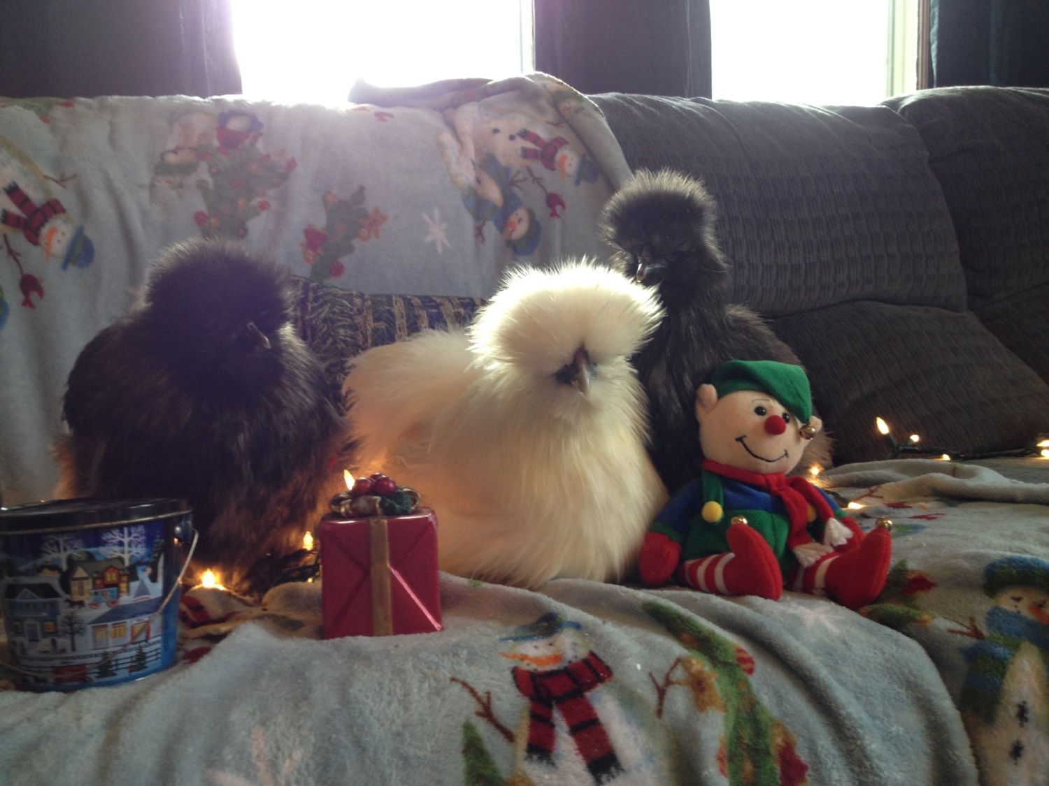 Beardy Brown, Top Knot and Lavender posing for our Christmas cards last year (Beardy and Lavendar are both partridge hens):