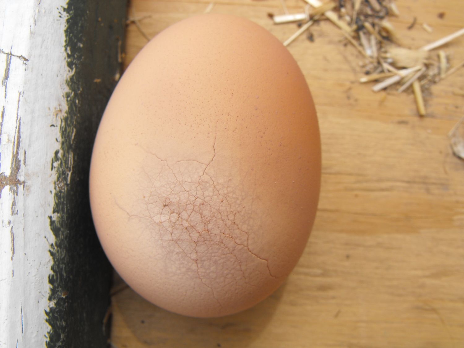 Okay Eggsperts, Godiva, my Australorp, only lays eggs on occasion. if she is feeling feisty one huge egg every other day. However, she hasn't laid an egg in about a month-ish. Until today. It maybe that the boys antics were stressing her out, and now that Cricket has his own flock at Raisenemrights, which has calmed my boys down, she felt comfortable to lay. Anyway I was so happy when I walked up to her just as the egg dropped, knowing she wasnt laying internally or egg bound. My happiness faded a bit though when I saw her egg. Now I have never seen anything like it, and she does have oyster shell so it wouldn't be calcium def., but this egg was cracked on both sides. It has two soft spots symmetrical on each side. I took pics and then opened it. The yolk looked fine other than a bit of what looked like dirt in it. Here is the huge egg, tell me what you all think. She is about 2 years old.