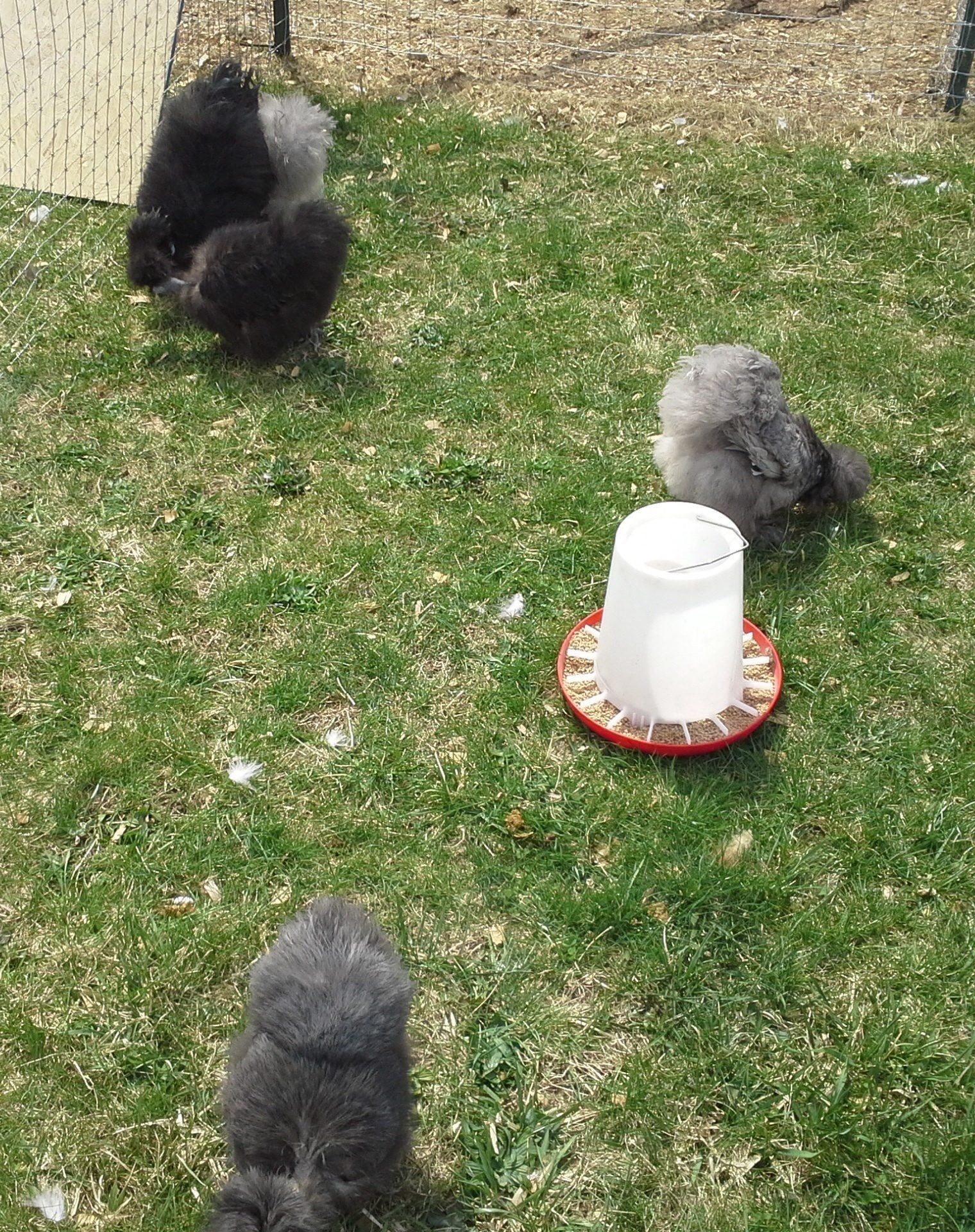 My Granddaughters FFA ham sold at auction for 3grand so she has $ in her college account so we had Roast Beef for our dinner. My adult children all had other places to be so they were in and out at different times all day. I had chicken chores t do and my H had sleep to catch up on (nothing new there). Left the girls out of the Pen to free range and opened the littles grow out pen so they could "kinda" take over the big girls pen for a while. Waddles ( my duck formerly known as Armelia) and Blinky along with Diamond and Earl were all out with the Big girls too. When I went out to close everyone up in their respective coops I noticed a suspicious amount of black and dark brown feathers all over the big girls pen right by the enterance to the grow out pen. I did a headcount and I am missing 4 babies