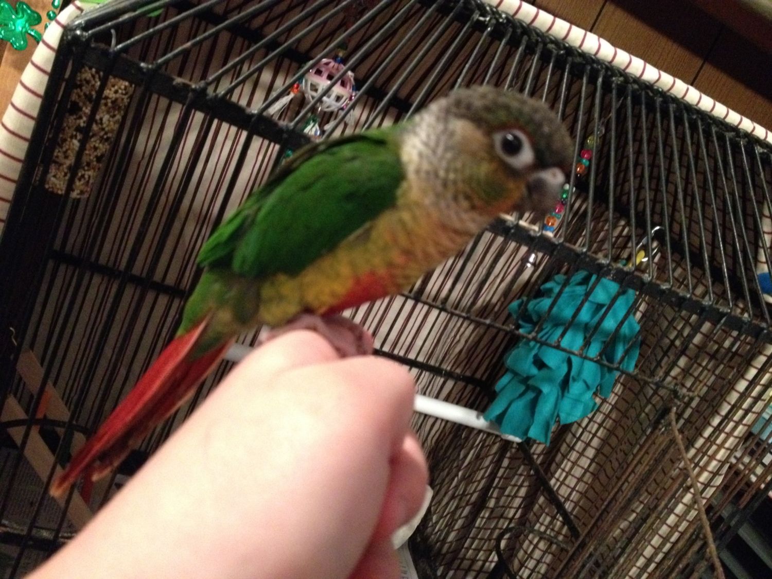 A Yellow sided green cheek conure. Her name is Jade. She is 10 weeks old today