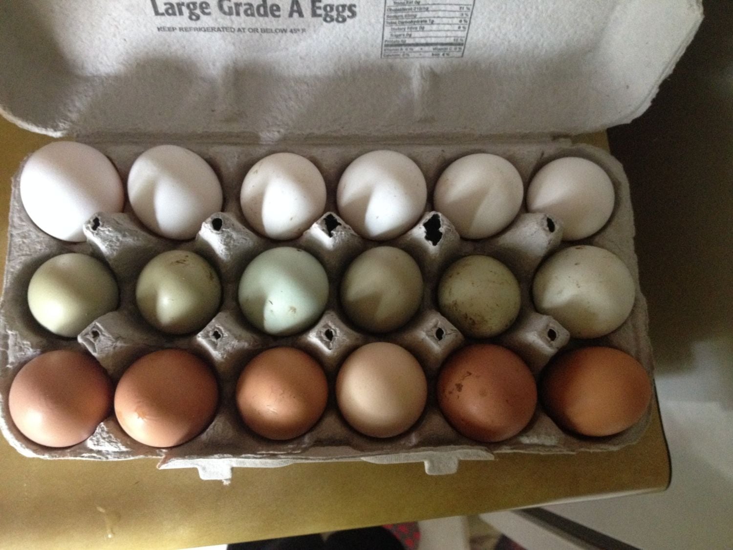 Starting to get a variety of eggs. The middle row is actually a bunch of really pretty blue eggs, no white or green like it looks in the pic.